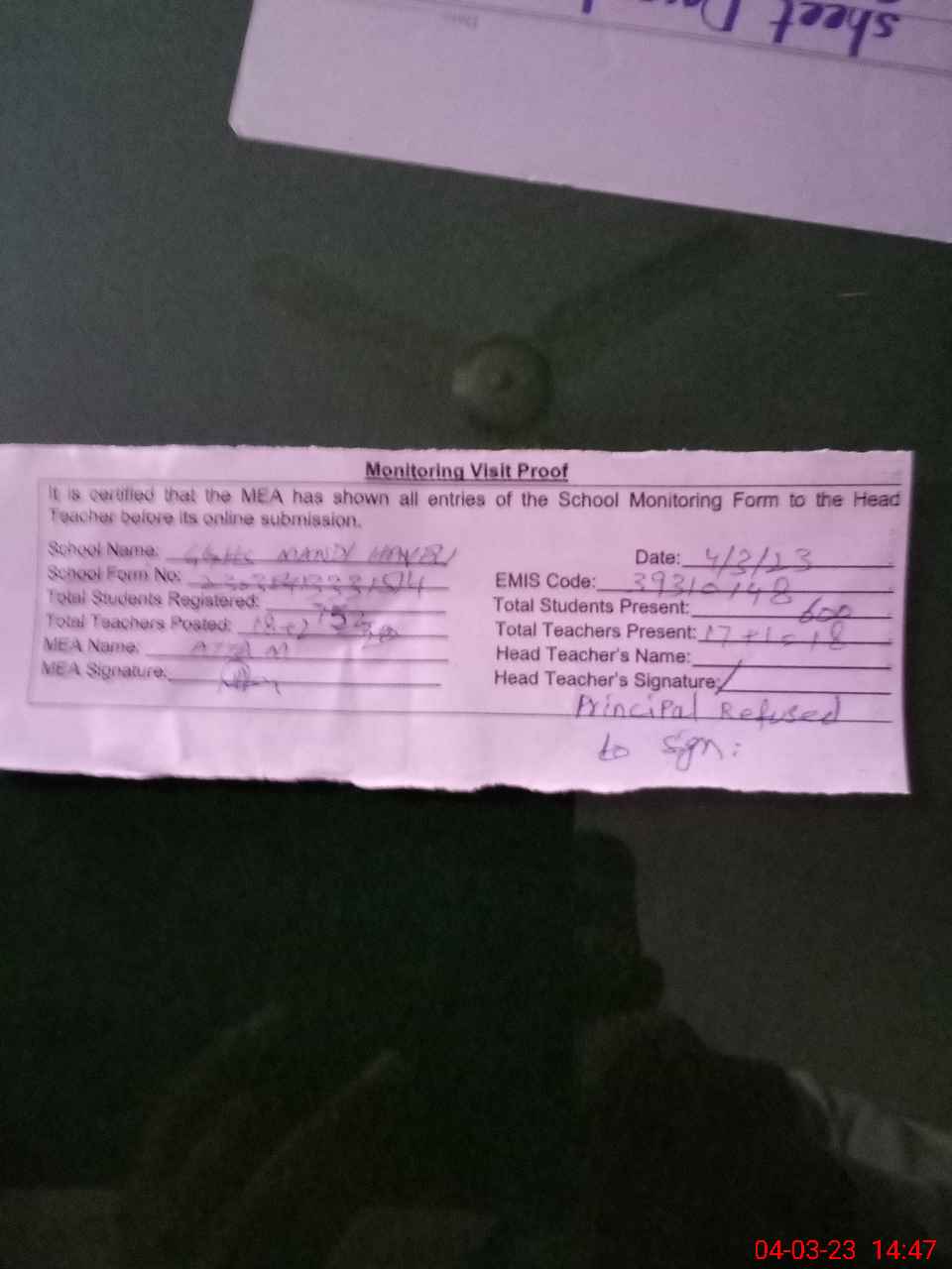 | Attendance Register | Head Teacher | MEA with School | Visit Proof |