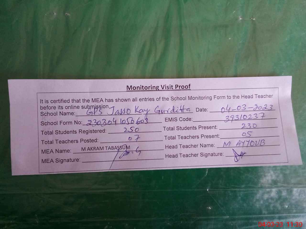 | Attendance Register | Head Teacher | MEA with School | Visit Proof |