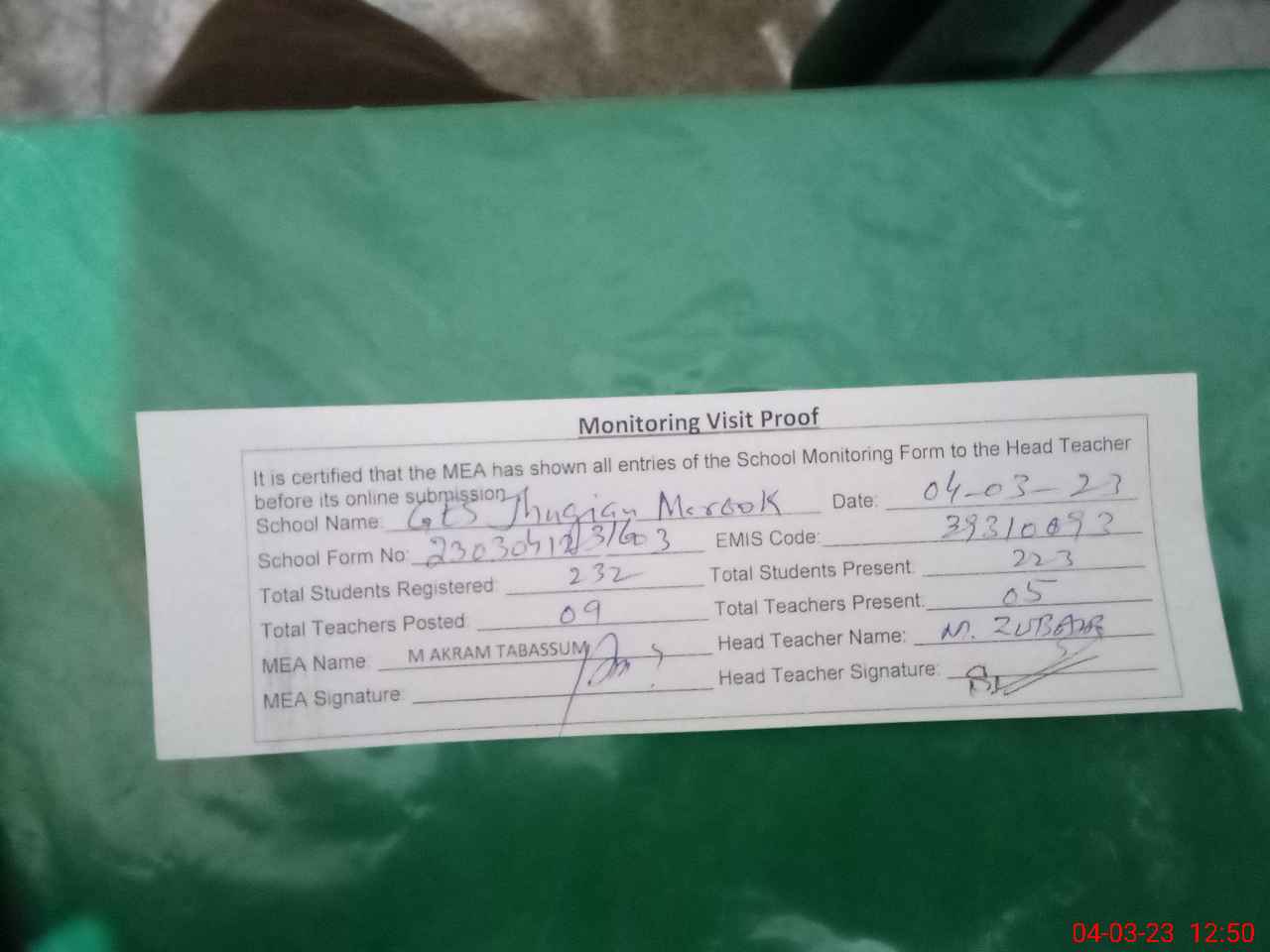 | Attendance Register | Head Teacher | MEA with School | Visit Proof |