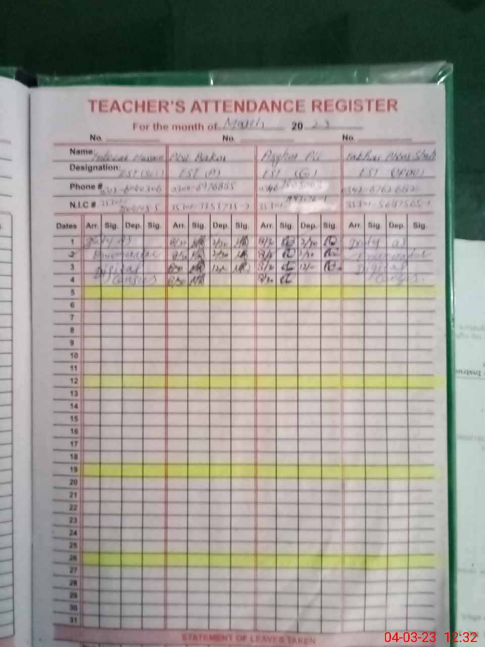 | CNIC | Full Name | Designation | R/C | Absence During Last Calender Month |