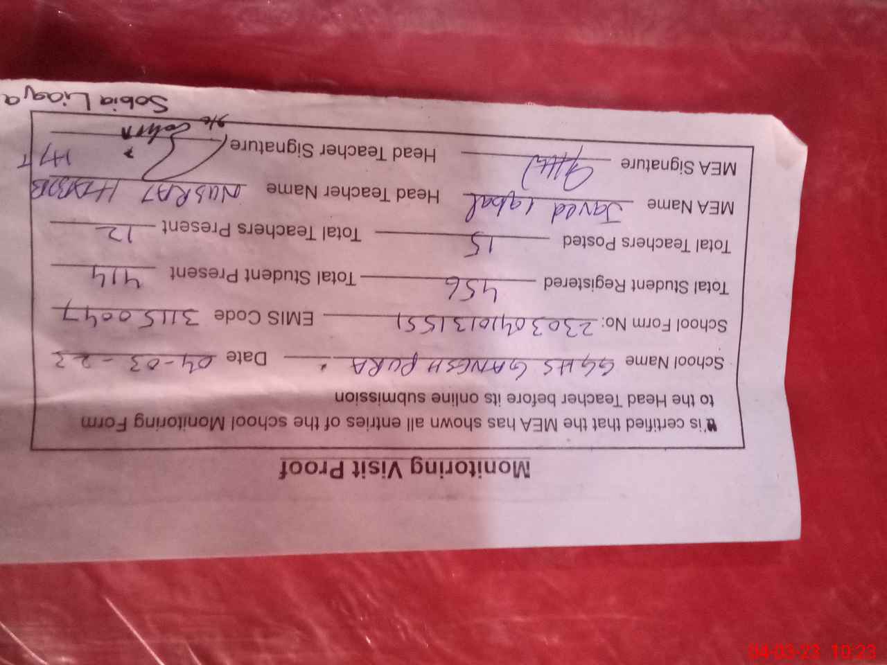 | EMIS Code: 31150047 | Name of School: GGHS GANESH PURA | |||