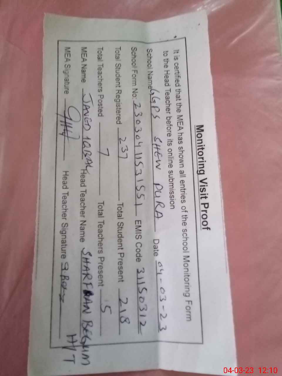 | Attendance Register | Head Teacher | MEA with School | Visit Proof |