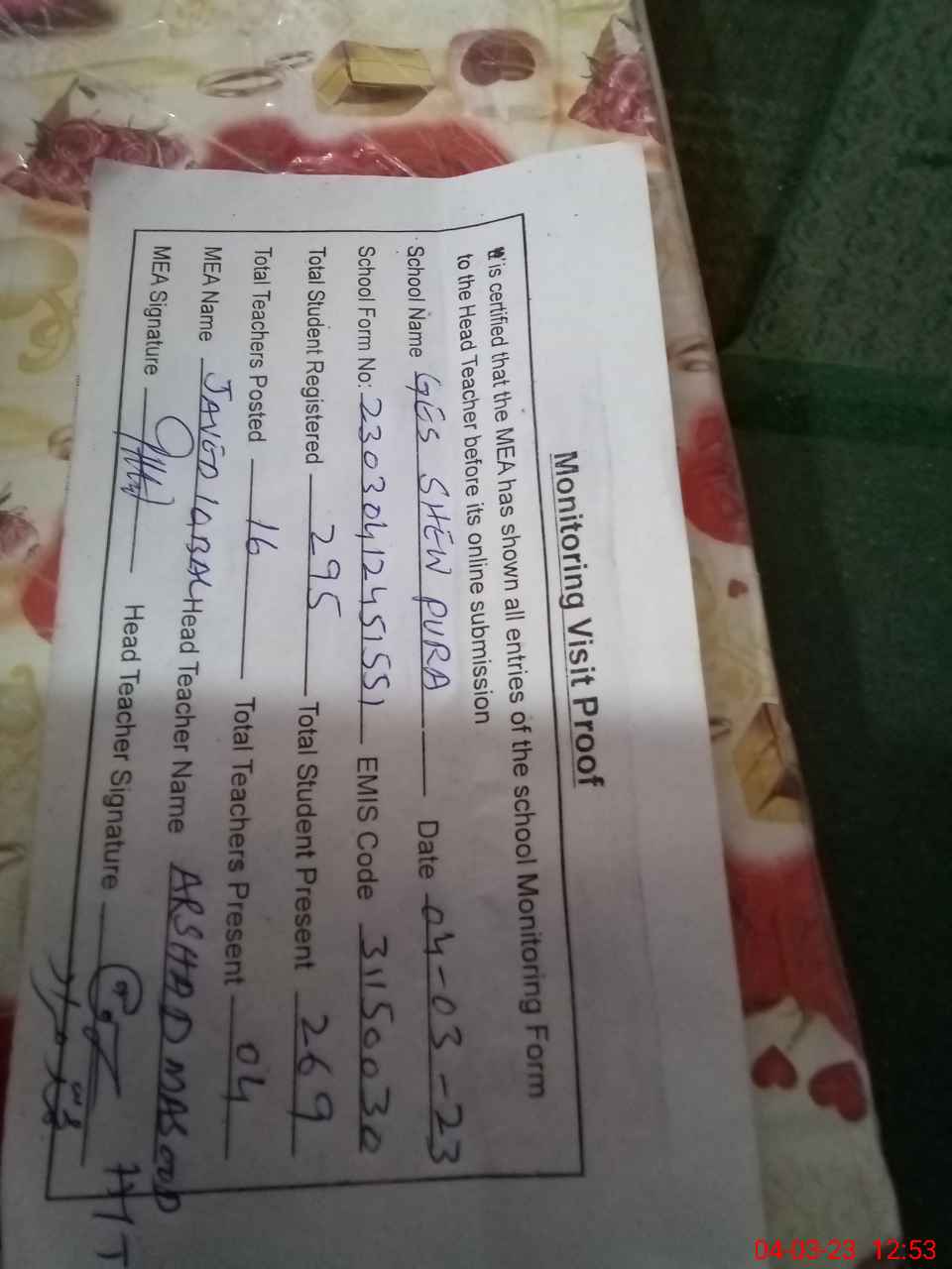 | Attendance Register | Head Teacher | MEA with School | Visit Proof |
