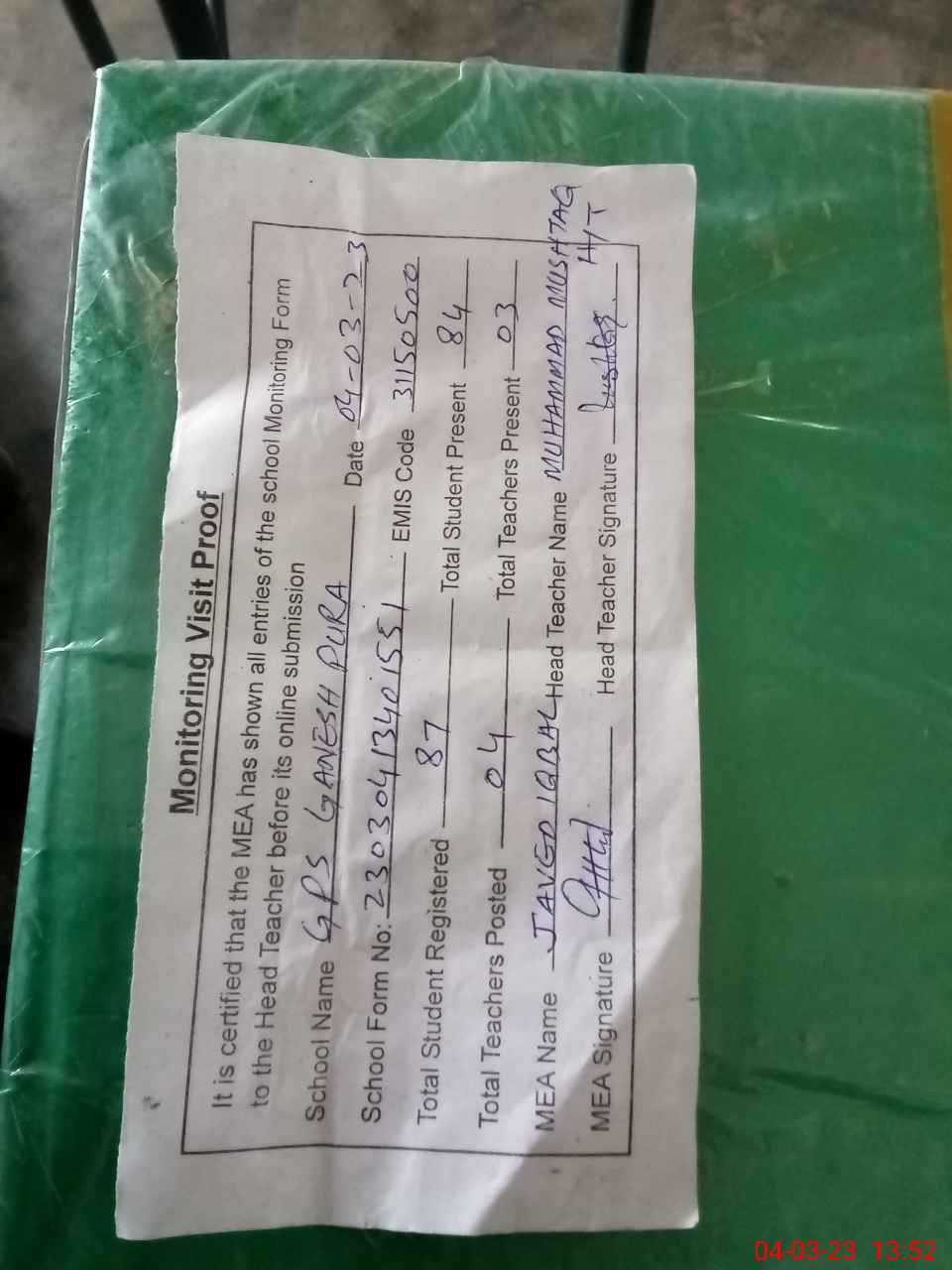 | Attendance Register | Head Teacher | MEA with School | Visit Proof |