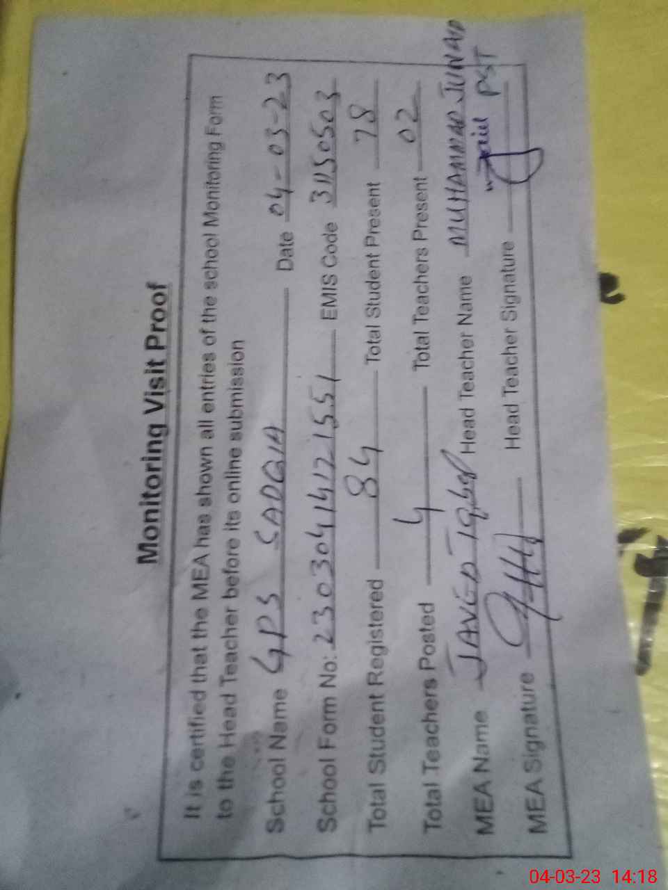 | Attendance Register | Head Teacher | MEA with School | Visit Proof |