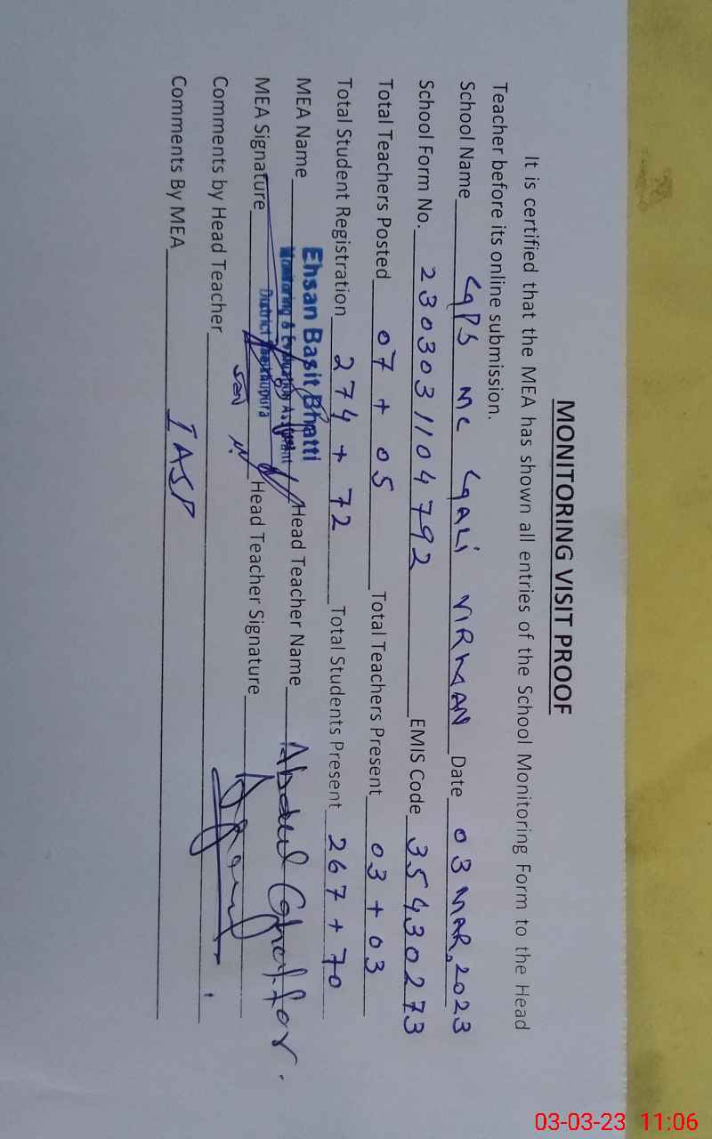 | Certified that this School was Inspected by the Undersigned MEA/DMO Today and the Information Stated Above is as Per Record. | |||||