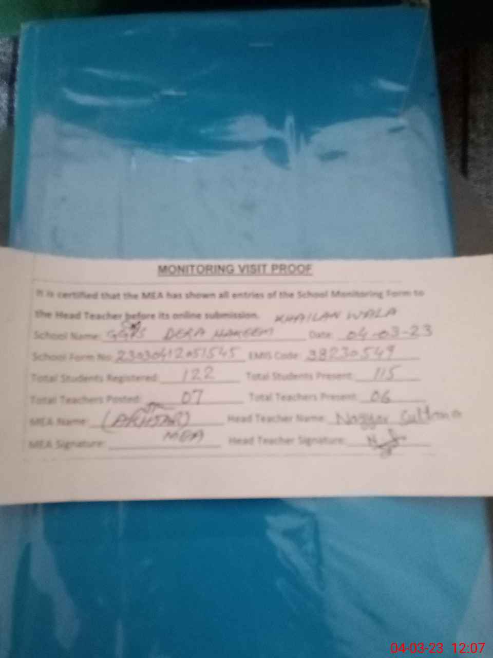 | EMIS Code: 38230549 | Name of School: GGCMS DERA HAKEEM KHILAN WALA | |||