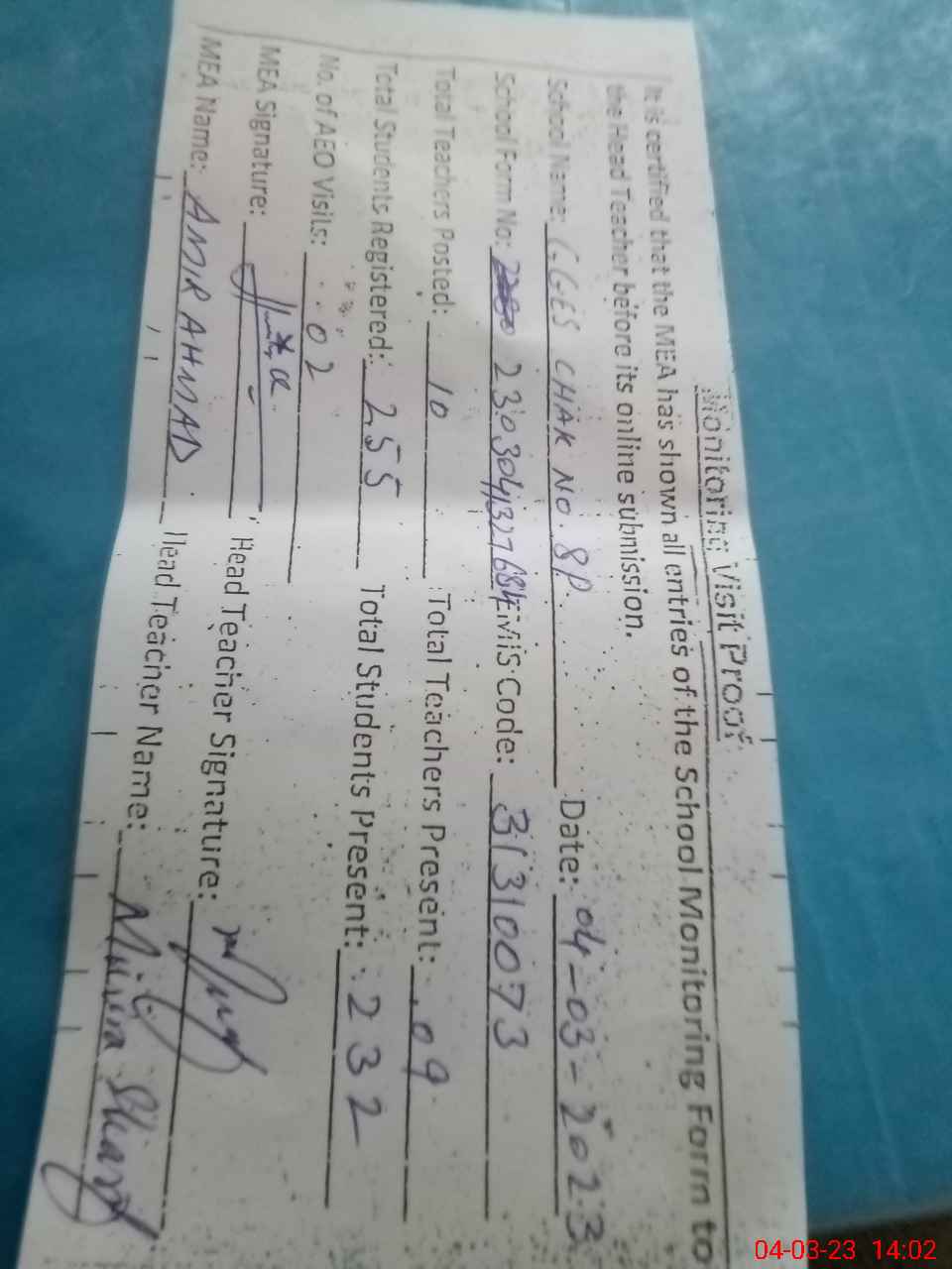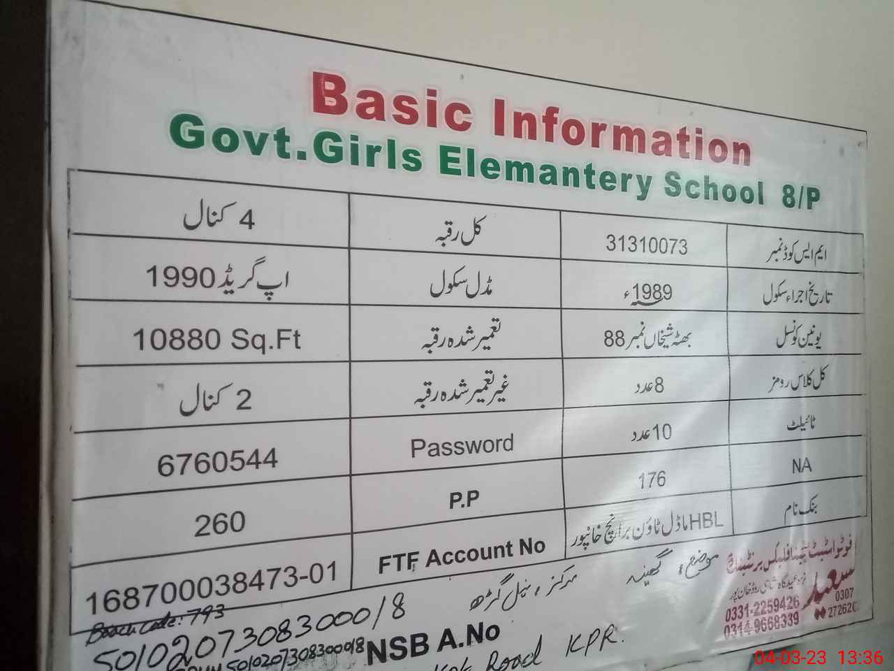 | EMIS Code: 31310073 | Name of School: GGES CHAK NO. 8/P | |||