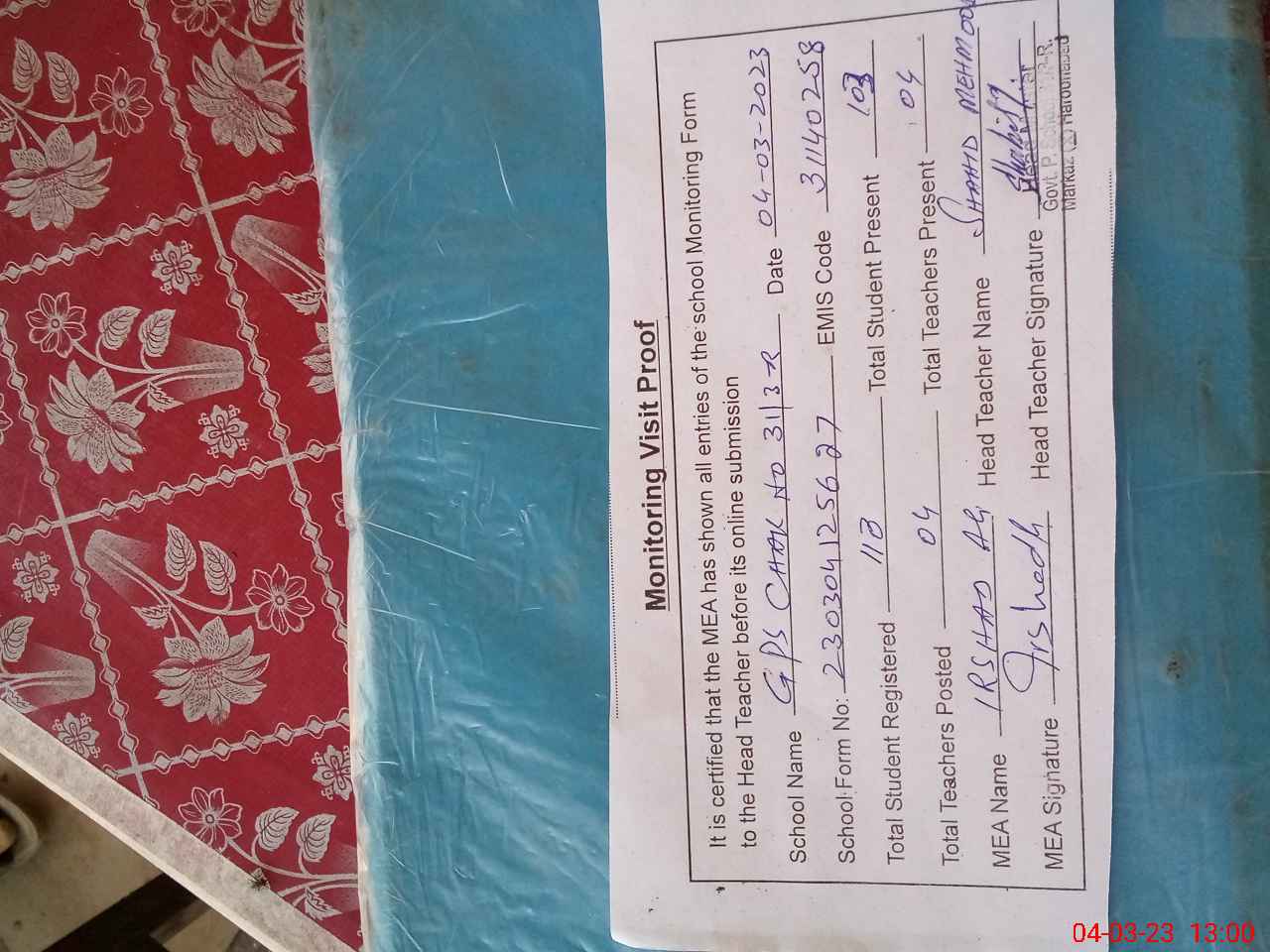 | Attendance Register | Head Teacher | MEA with School | Visit Proof |