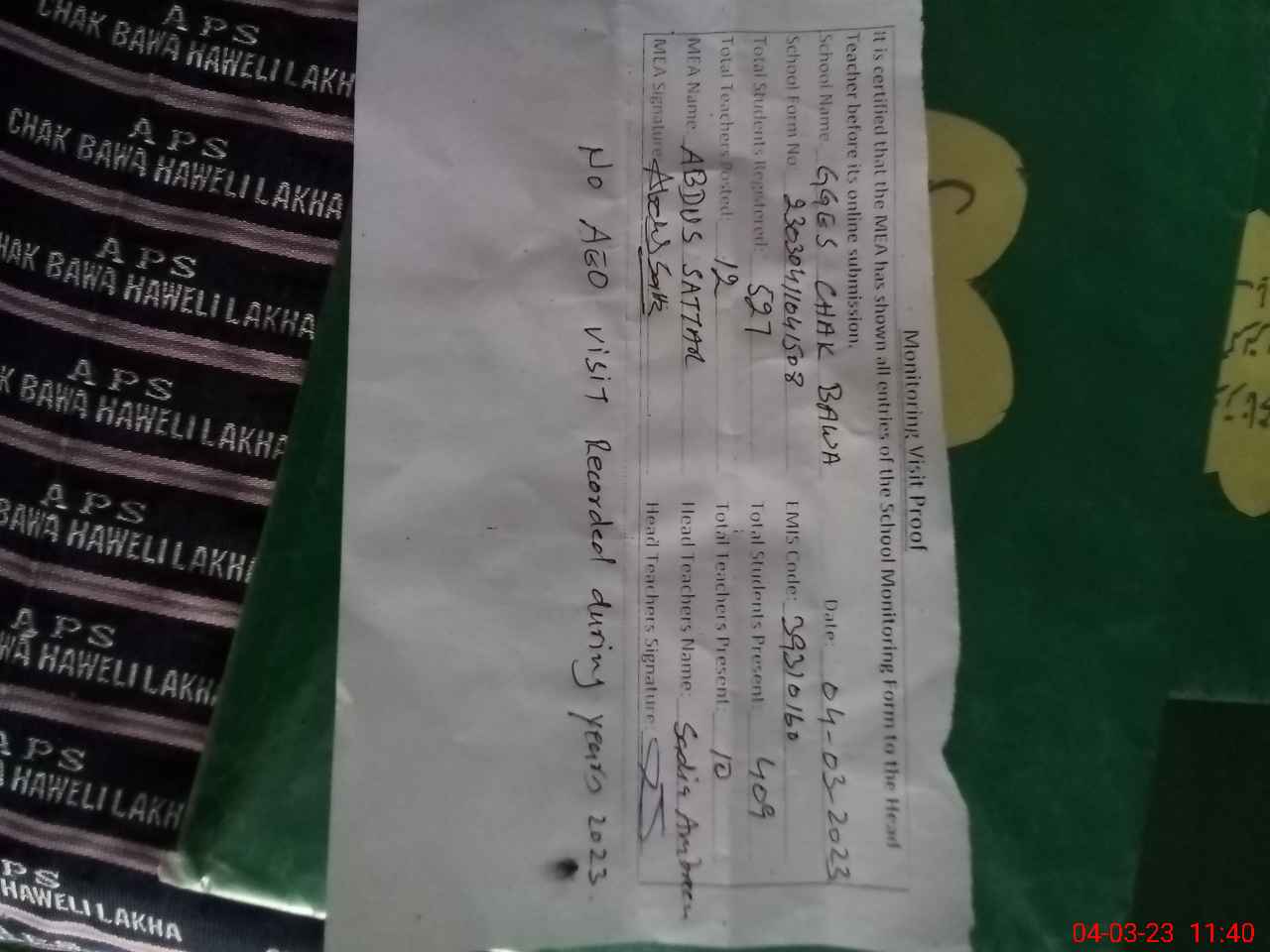| Attendance Register | Head Teacher | MEA with School | Visit Proof |