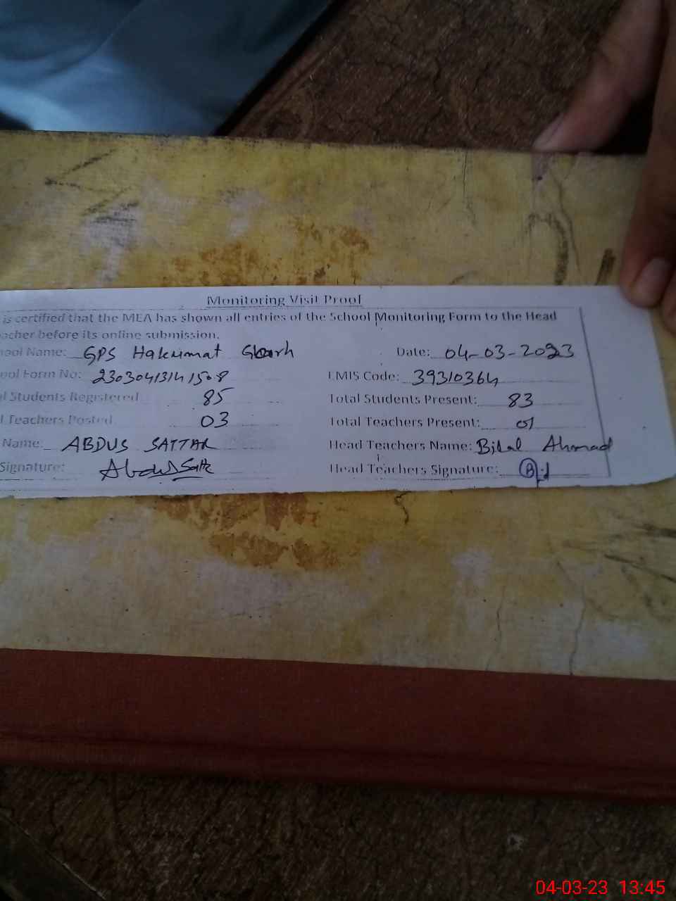 | Attendance Register | Head Teacher | MEA with School | Visit Proof |