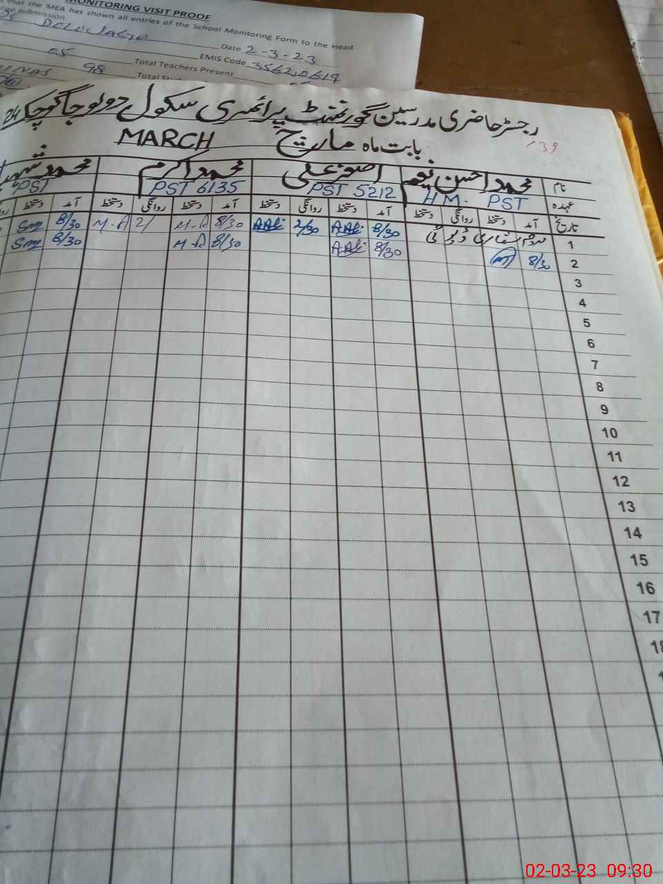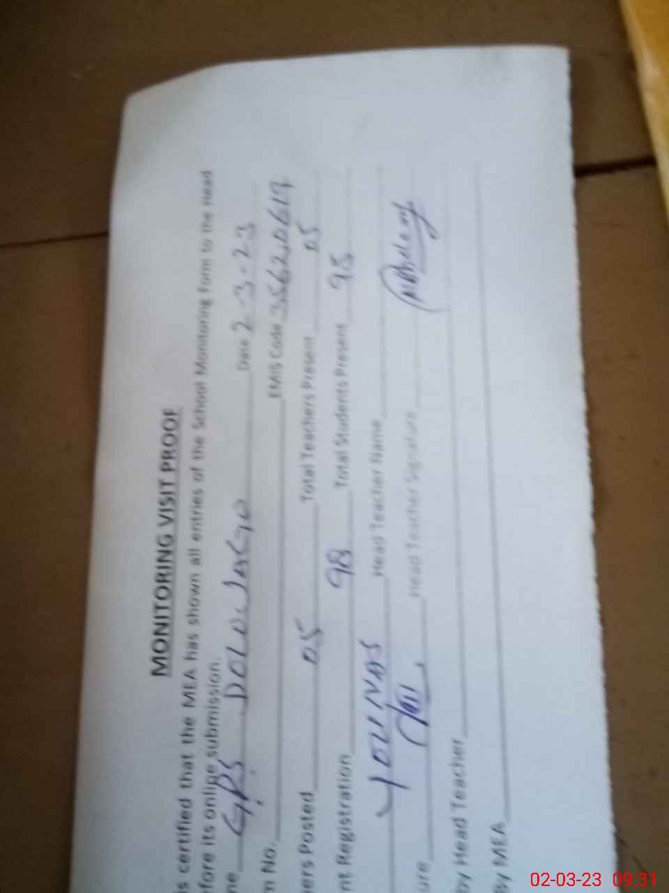 | Attendance Register | Head Teacher | MEA with School | Visit Proof |