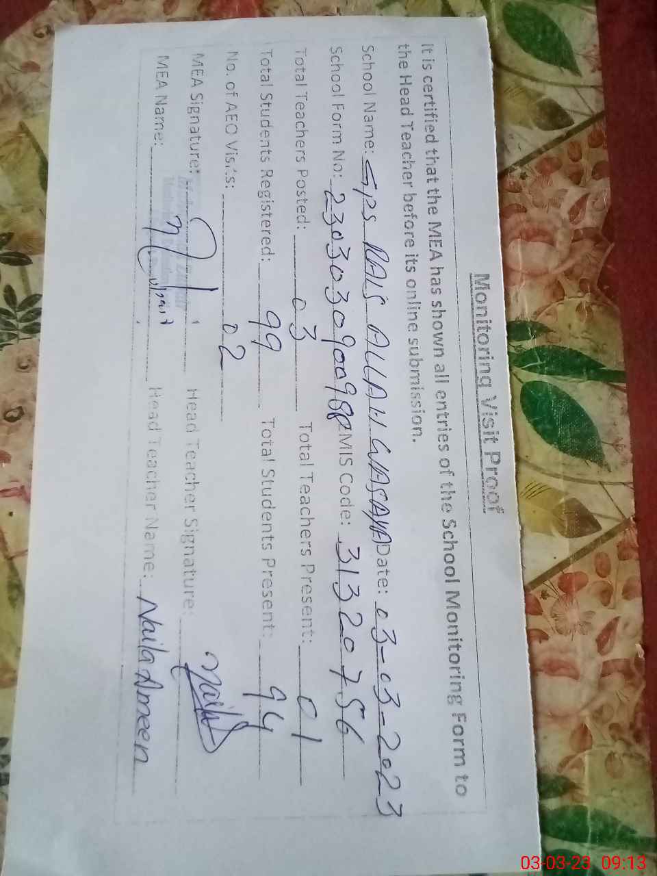 | Attendance Register | Head Teacher | MEA with School | Visit Proof |