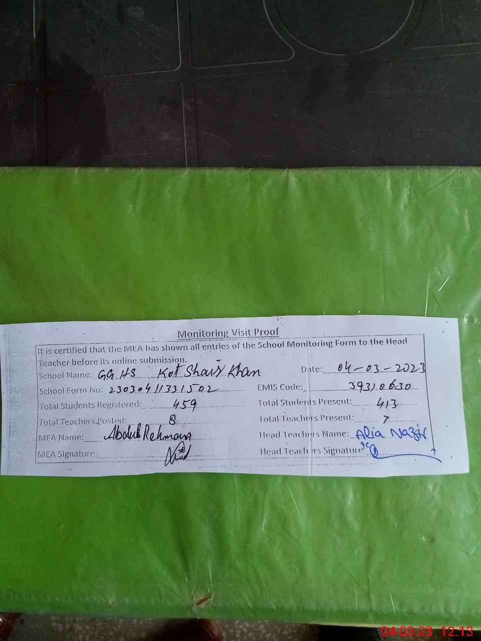| Attendance Register | Head Teacher | MEA with School | Visit Proof |