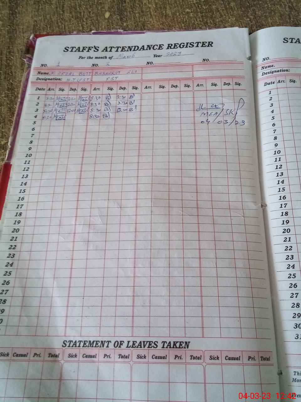| Leave | Duty | Absent | Maternity | Medical | Ex- Pak |