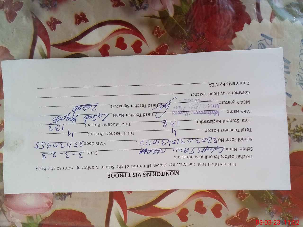 | Attendance Register | Head Teacher | MEA with School | Visit Proof |