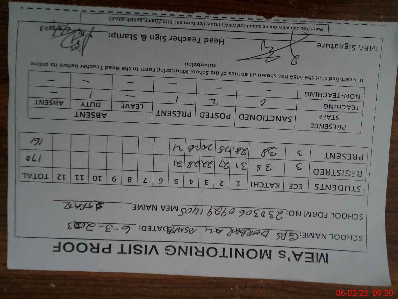 | Attendance Register | Head Teacher | MEA with School | Visit Proof |