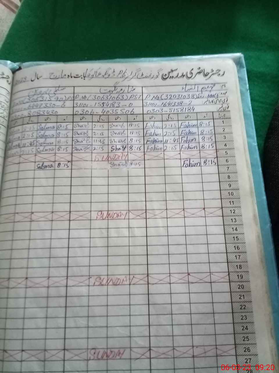| CNIC | Full Name | Designation | R/C | Absence During Last Calender Month |