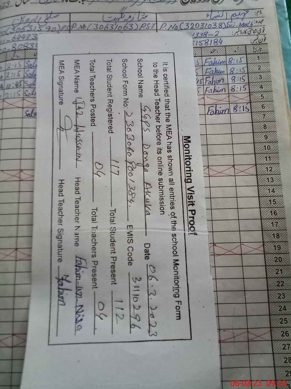 | Attendance Register | Head Teacher | MEA with School | Visit Proof |