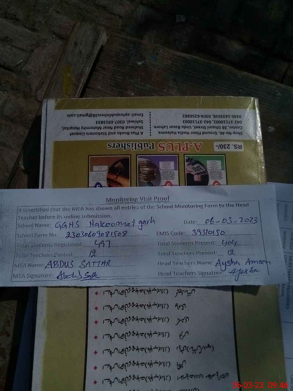 | Attendance Register | Head Teacher | MEA with School | Visit Proof |
