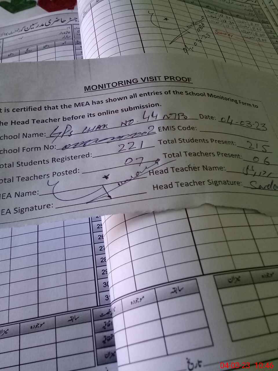 | Attendance Register | Head Teacher | MEA with School | Visit Proof |