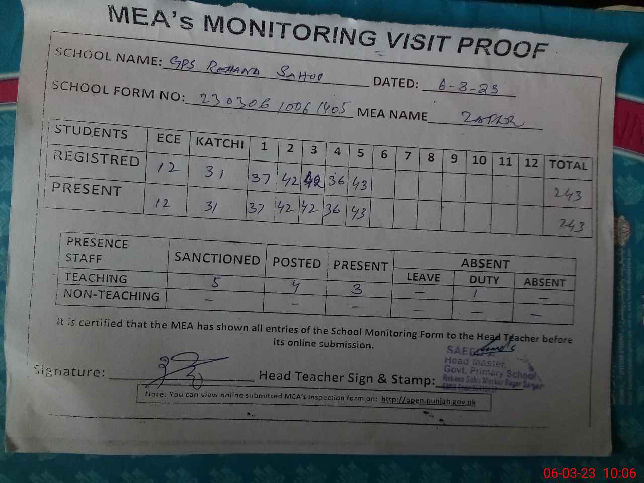 | Attendance Register | Head Teacher | MEA with School | Visit Proof |