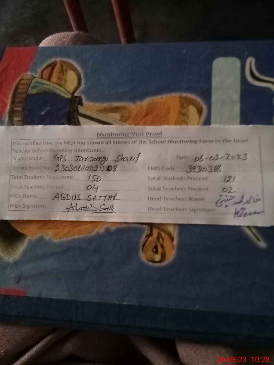 | Attendance Register | Head Teacher | MEA with School | Visit Proof |