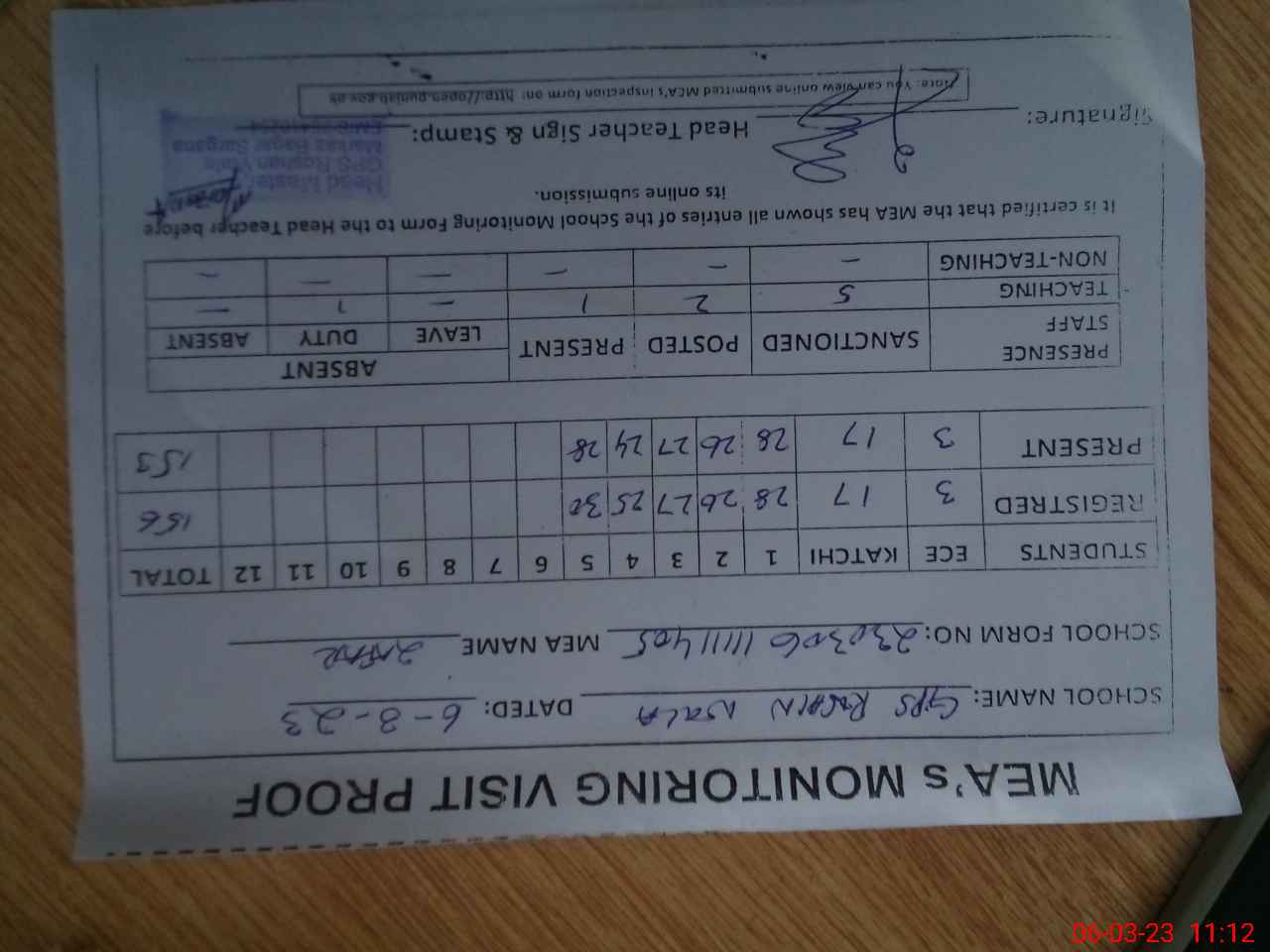 | Attendance Register | Head Teacher | MEA with School | Visit Proof |