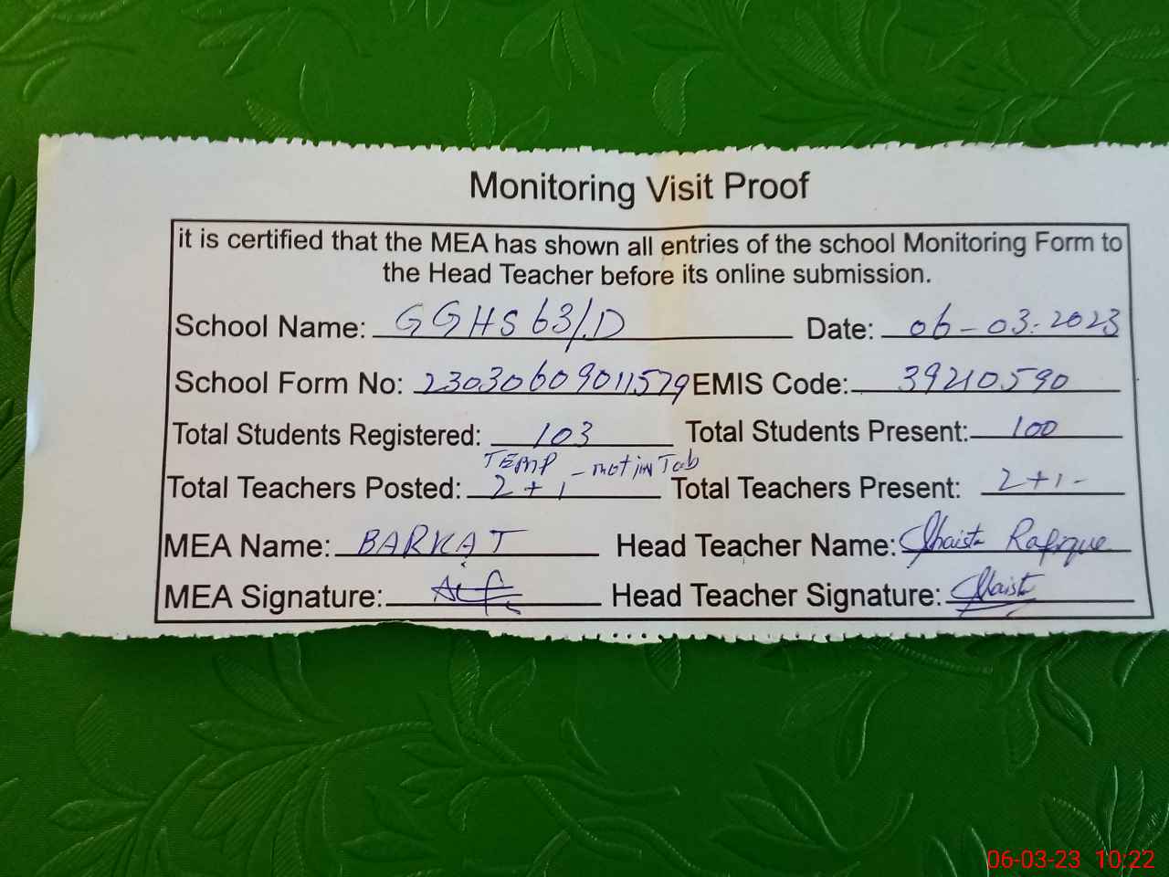 | EMIS Code: 39210590 | Name of School: GGHS 63/D CHOWK SIKANDER | |||