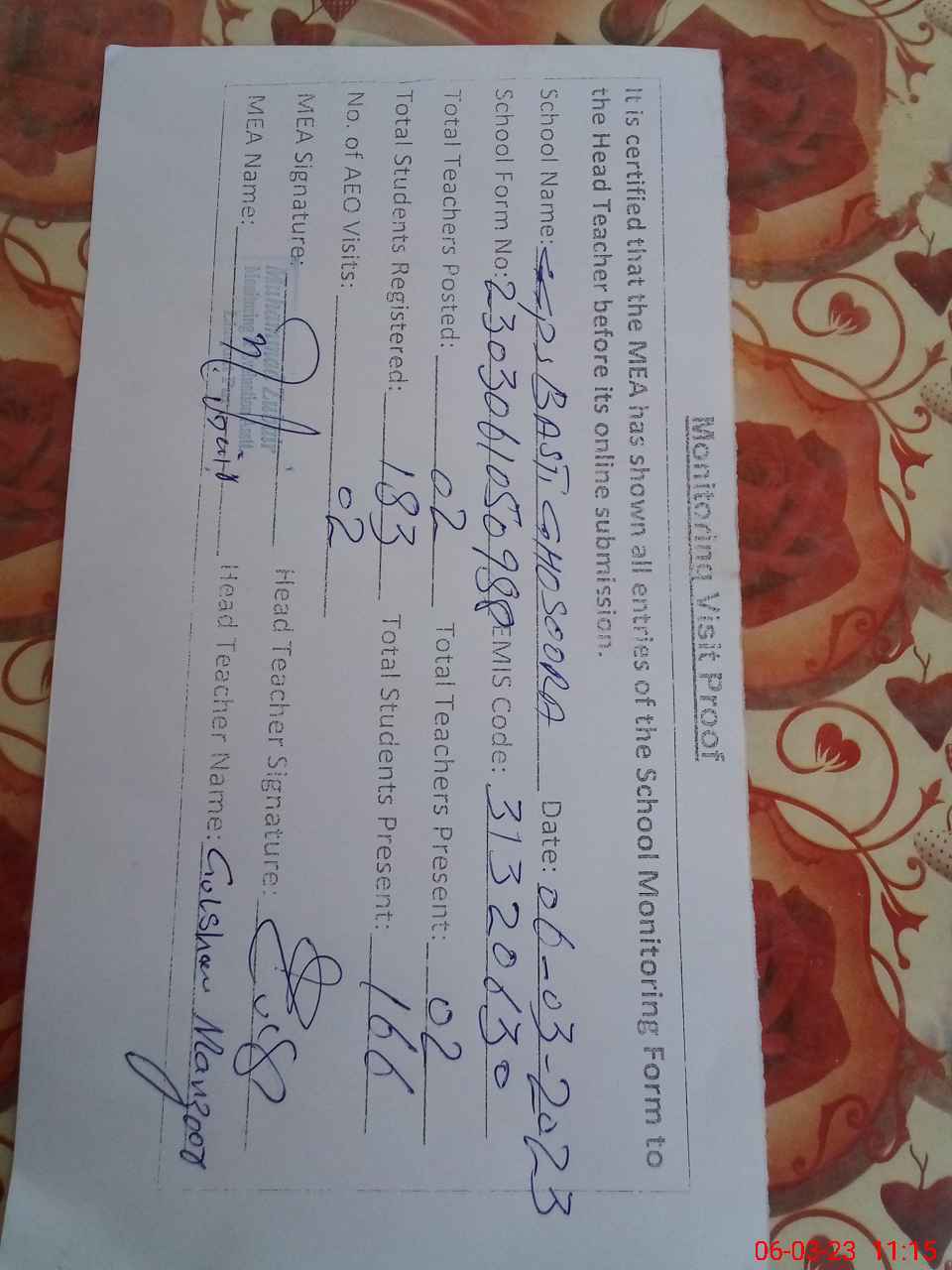 | Attendance Register | Head Teacher | MEA with School | Visit Proof |
