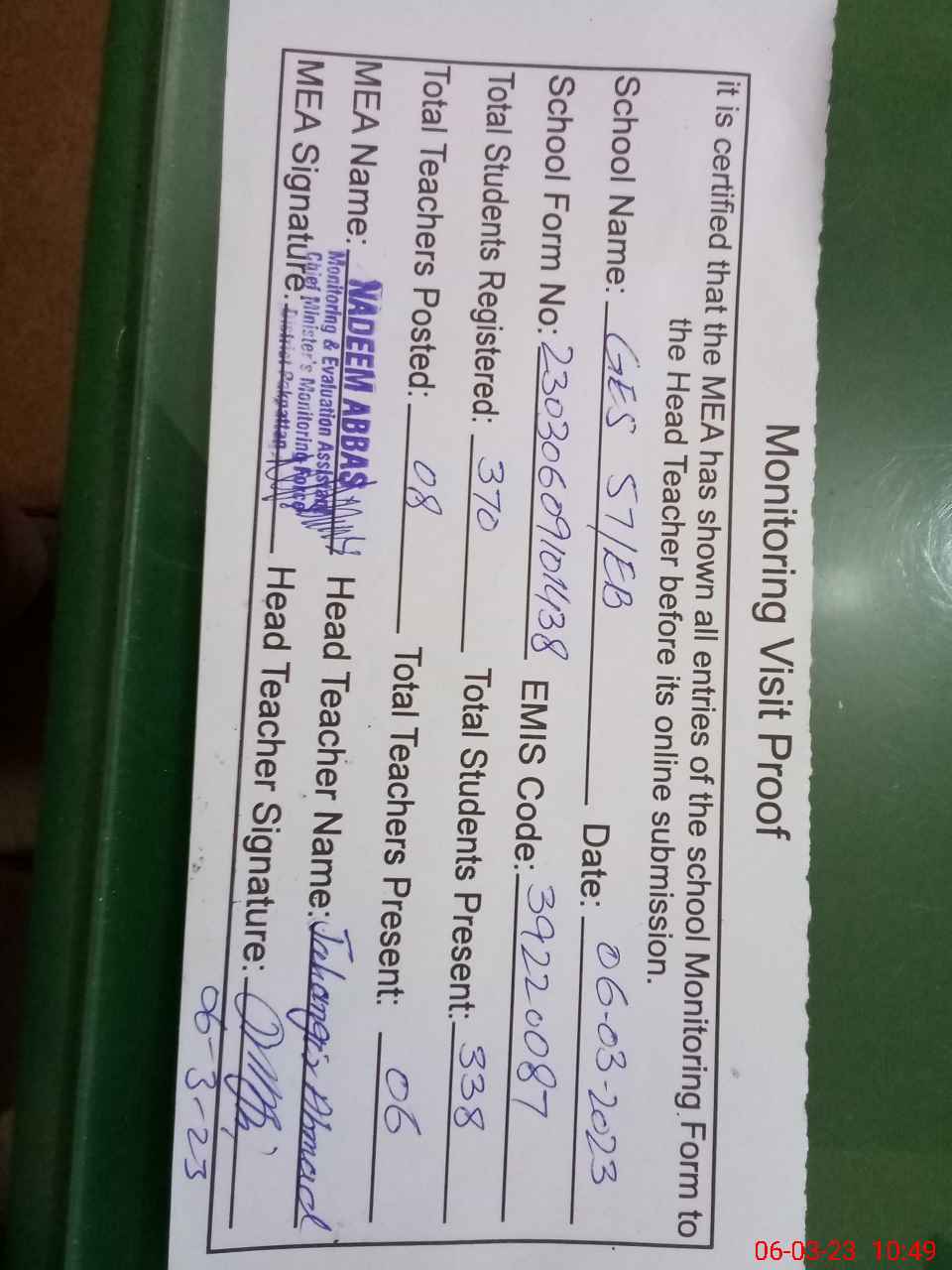 | Certified that this School was Inspected by the Undersigned MEA/DMO Today and the Information Stated Above is as Per Record. | |||||