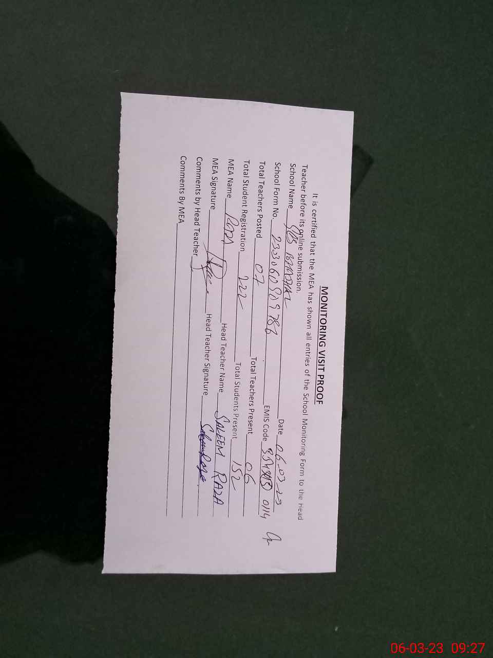 | Attendance Register | Head Teacher | MEA with School | Visit Proof |
