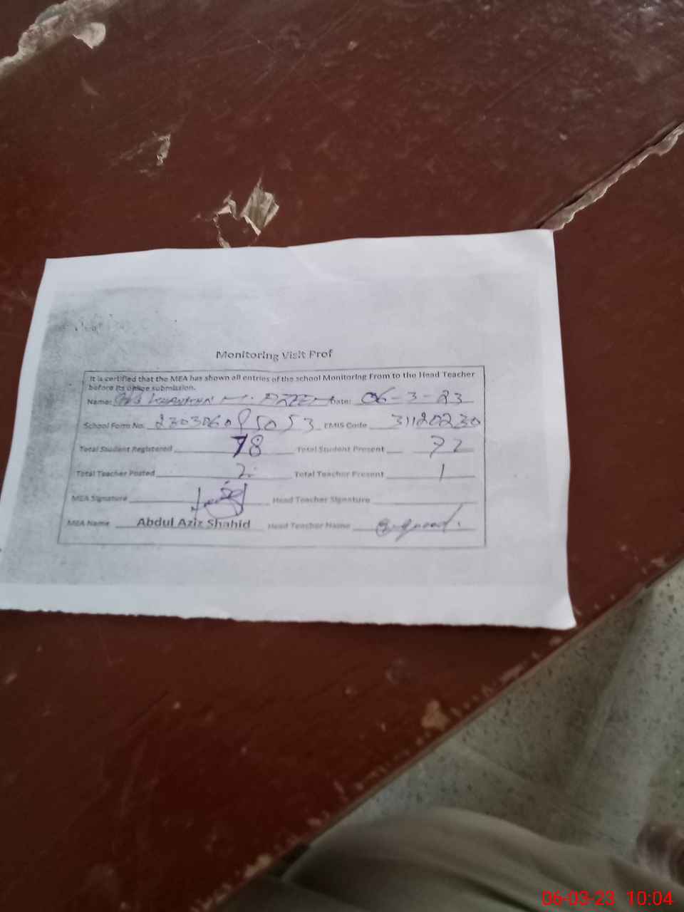 | Attendance Register | Head Teacher | MEA with School | Visit Proof |