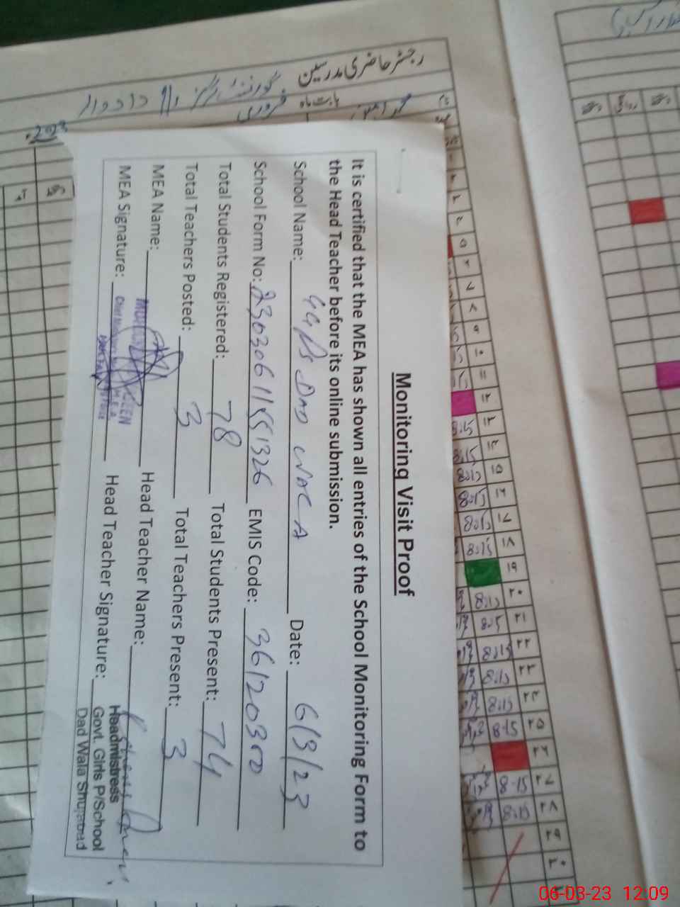 | Attendance Register | Head Teacher | MEA with School | Visit Proof |