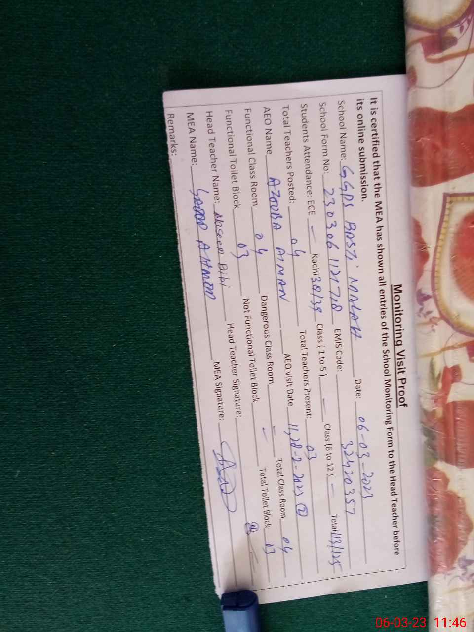 | Certified that this School was Inspected by the Undersigned MEA/DMO Today and the Information Stated Above is as Per Record. | |||||