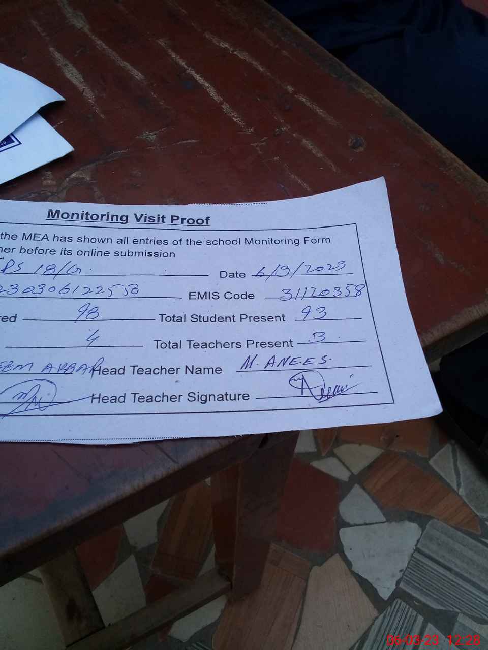 | Attendance Register | Head Teacher | MEA with School | Visit Proof |