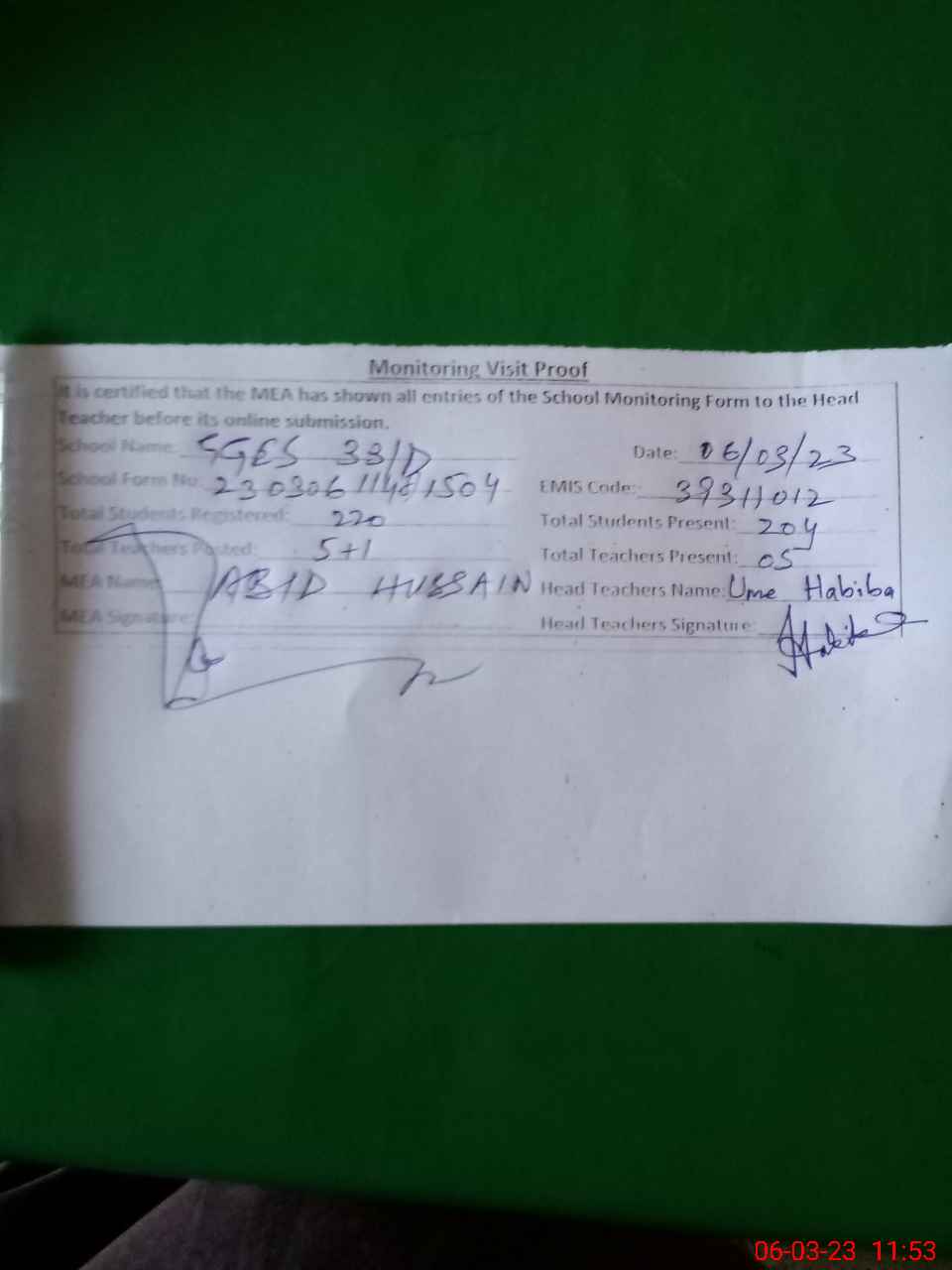 | EMIS Code: 39311012 | Name of School: GGES CHAK NO. 33-D | |||