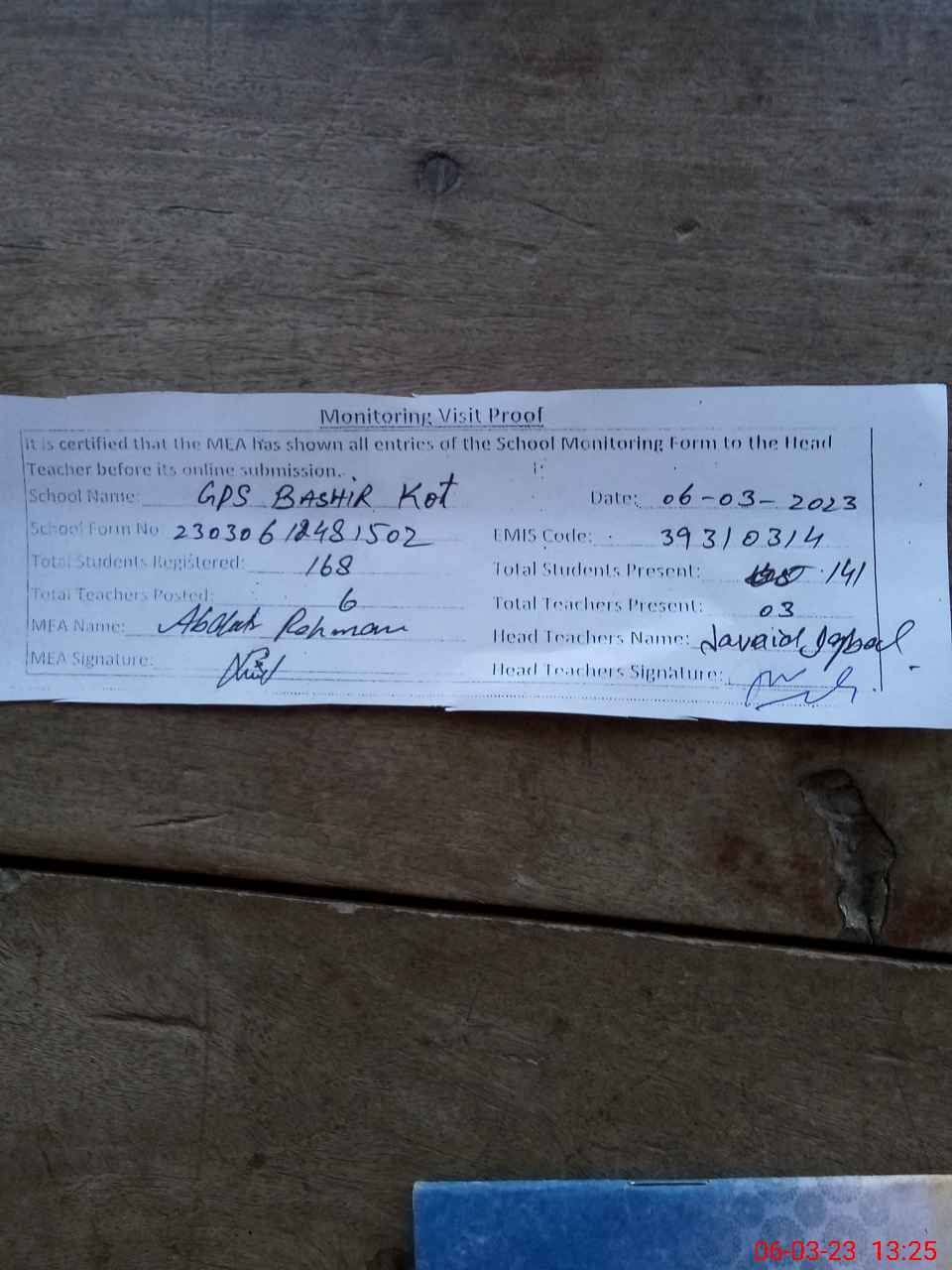 | EMIS Code: 39310314 | Name of School: GPS BASHIR KOT | |||