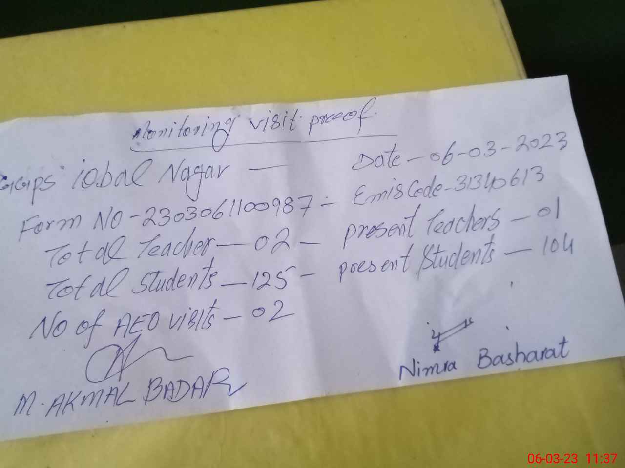 | EMIS Code: 31340613 | Name of School: GGPS IQBAL NAGAR | |||