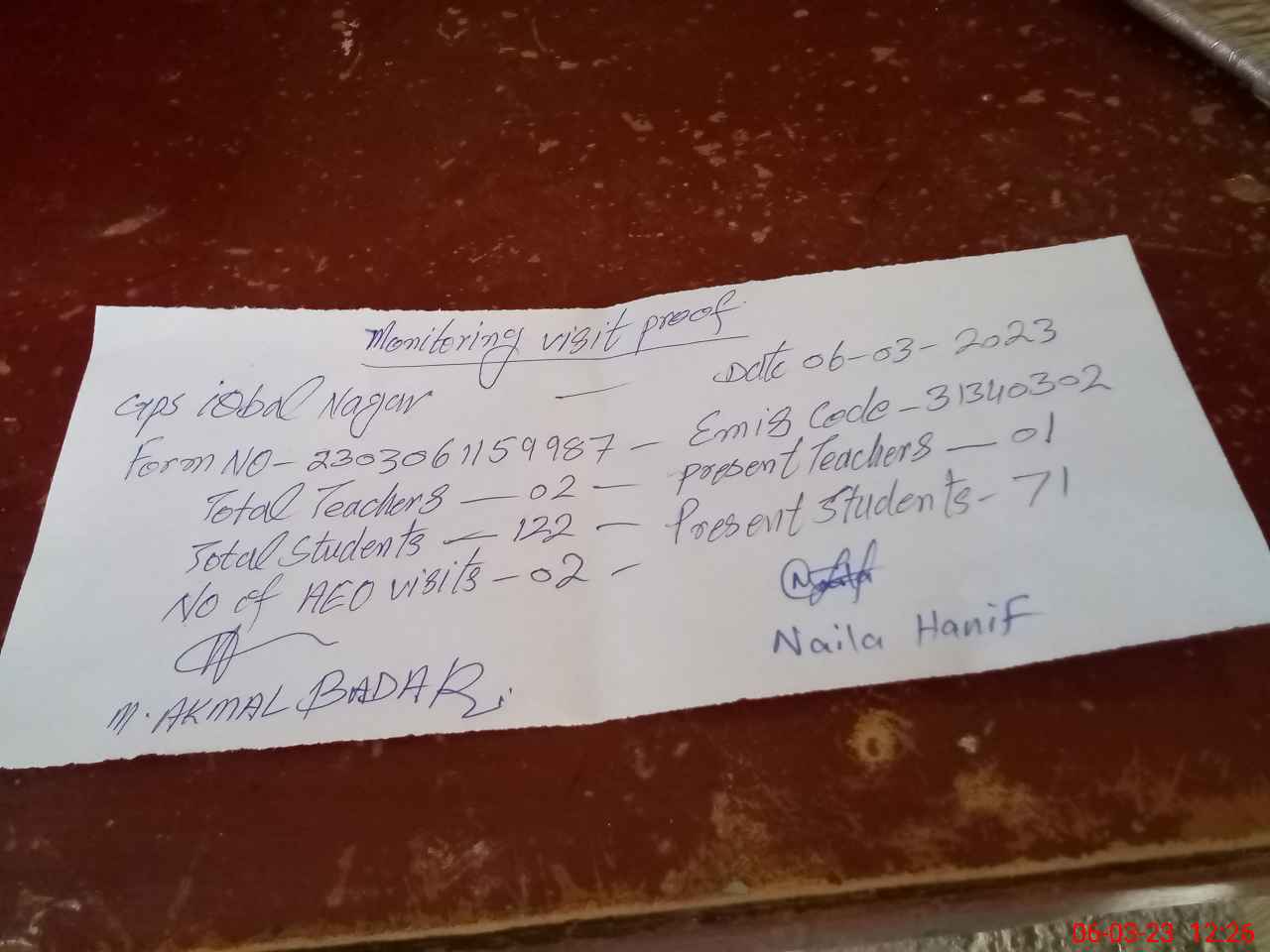 | EMIS Code: 31340302 | Name of School: GPS IQBAL NAGHAR | |||