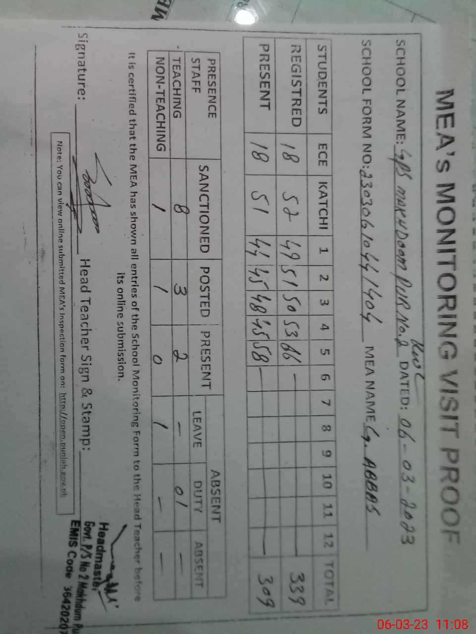 | EMIS Code: 36420207 | Name of School: GPS MAKHDOOM PUR NO.2 P/O MAKHDOOM PUR, KHANEWAL | |||