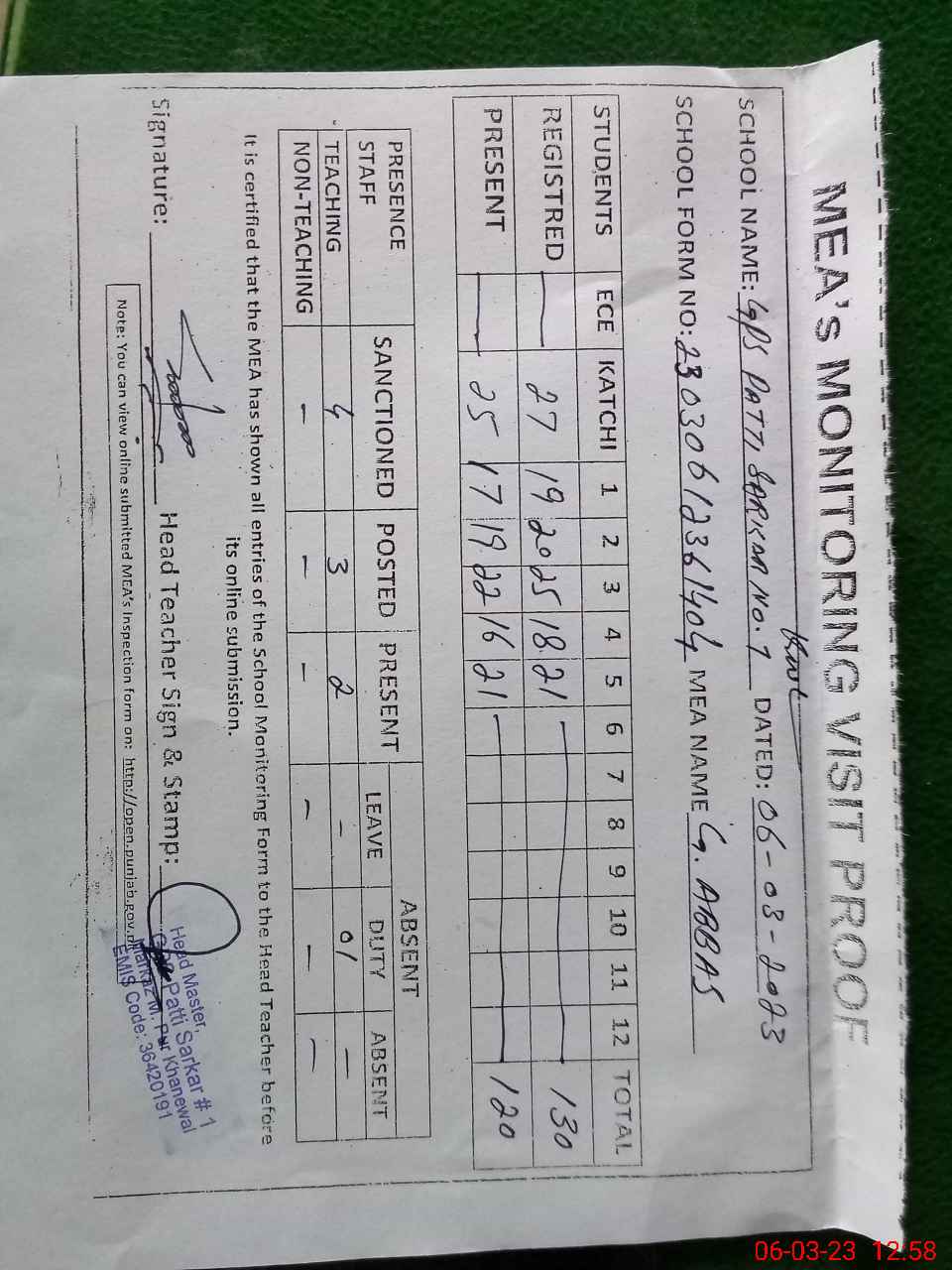 | Attendance Register | Head Teacher | MEA with School | Visit Proof |