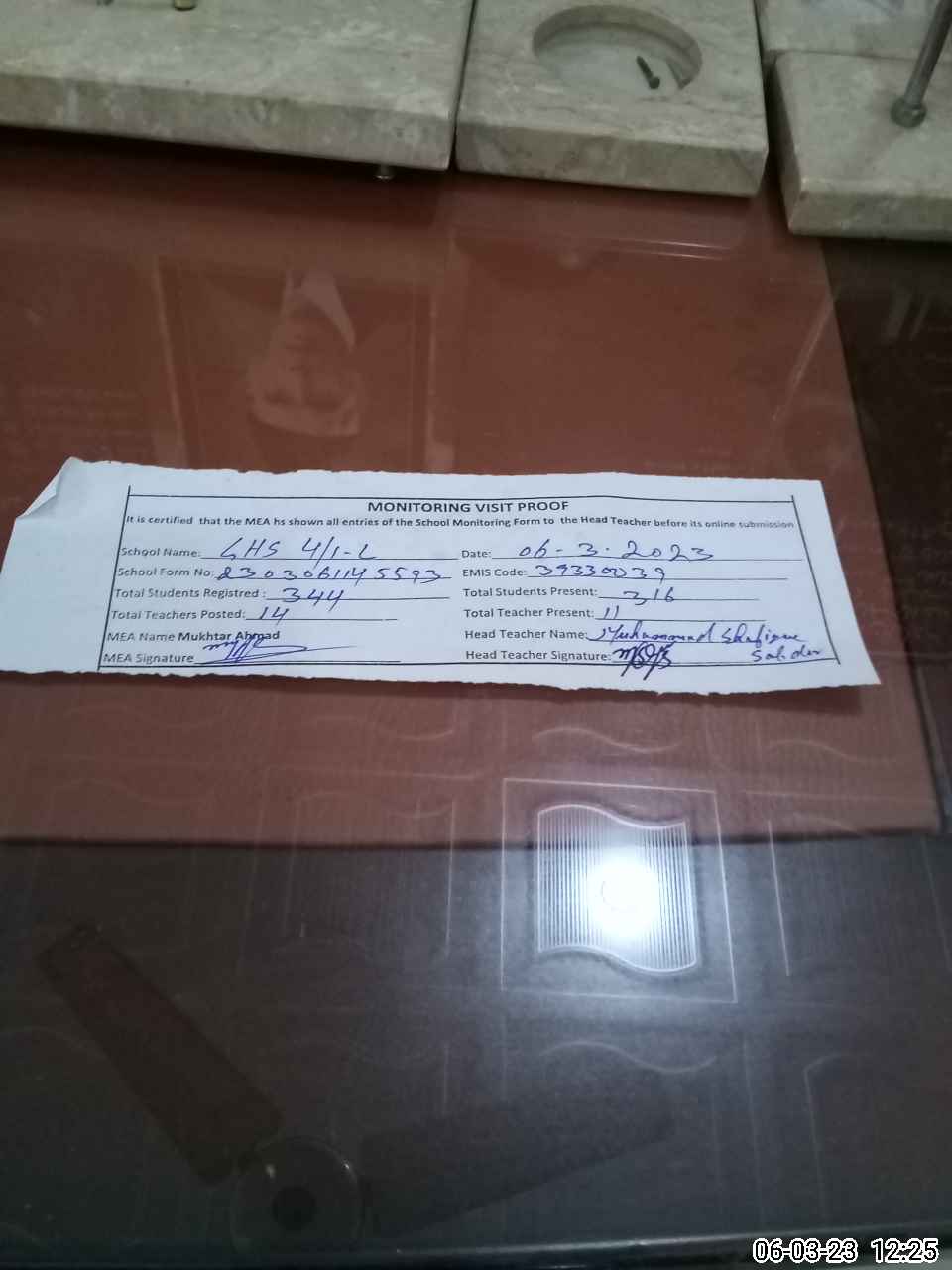 | Attendance Register | Head Teacher | MEA with School | Visit Proof |