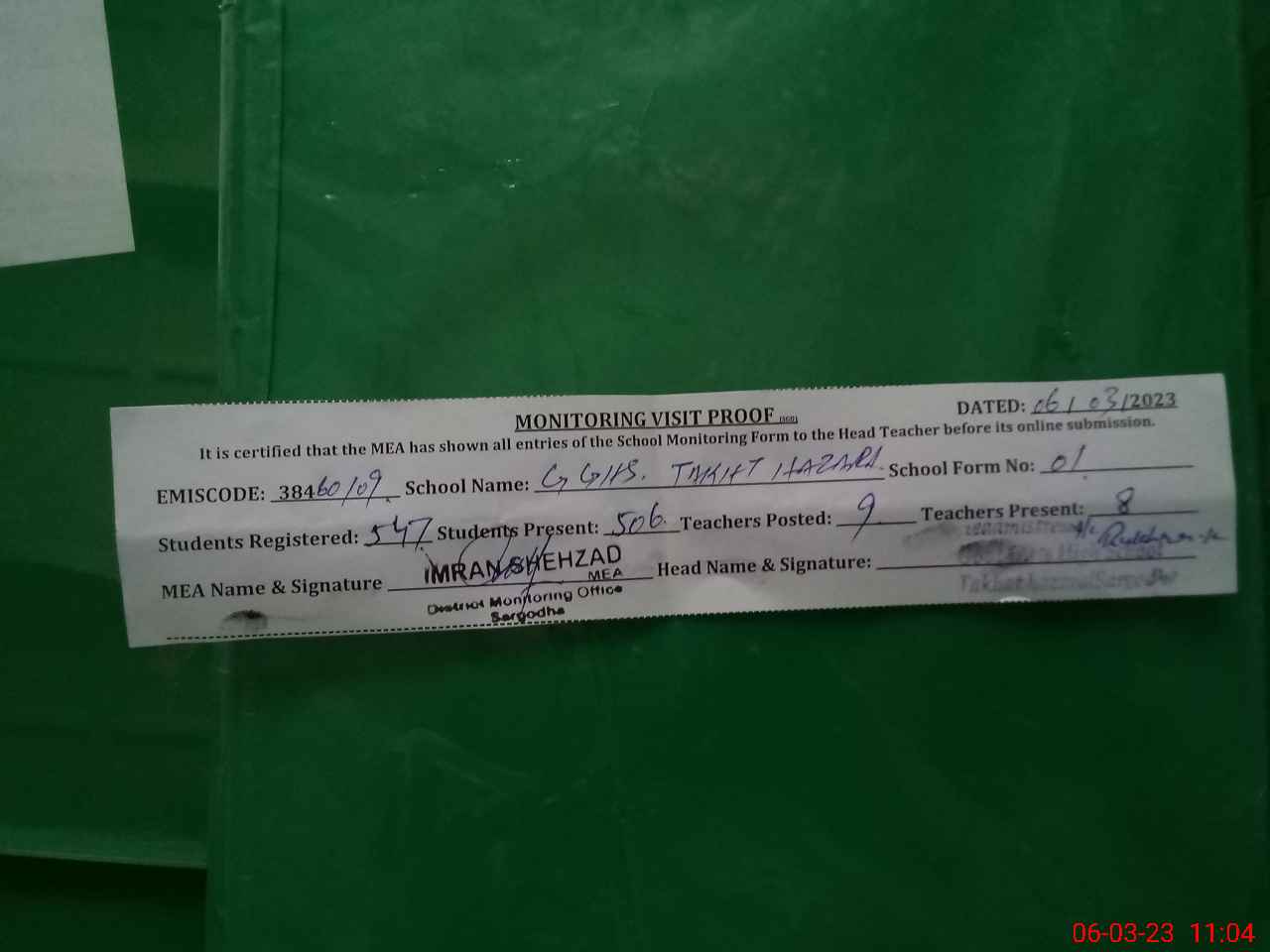 | EMIS Code: 38460109 | Name of School: GGHS TAKHT HAZARA | |||