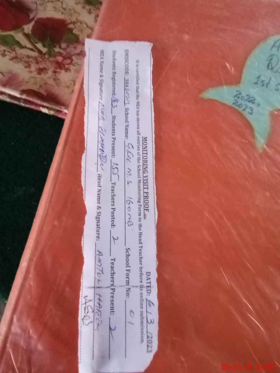 | Attendance Register | Head Teacher | MEA with School | Visit Proof |