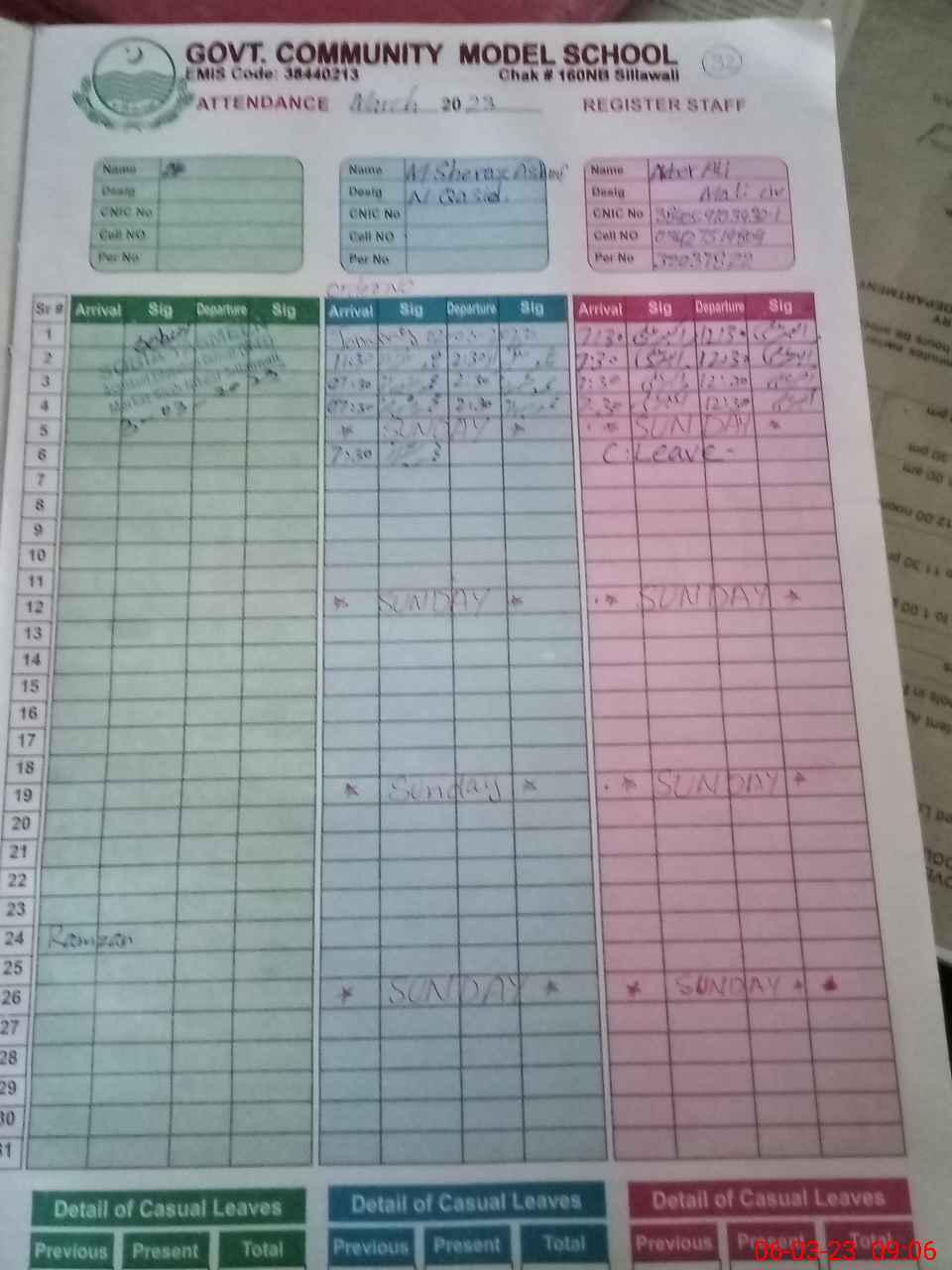 | CNIC | Full Name | Designation | R/C | Absence During Last Calender Month |