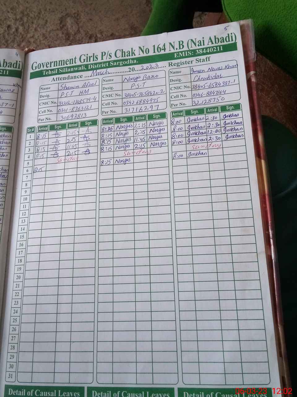 | CNIC | Full Name | Designation | R/C | Absence During Last Calender Month |