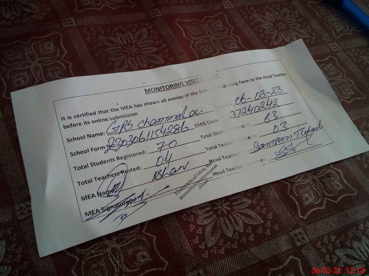 | Attendance Register | Head Teacher | MEA with School | Visit Proof |