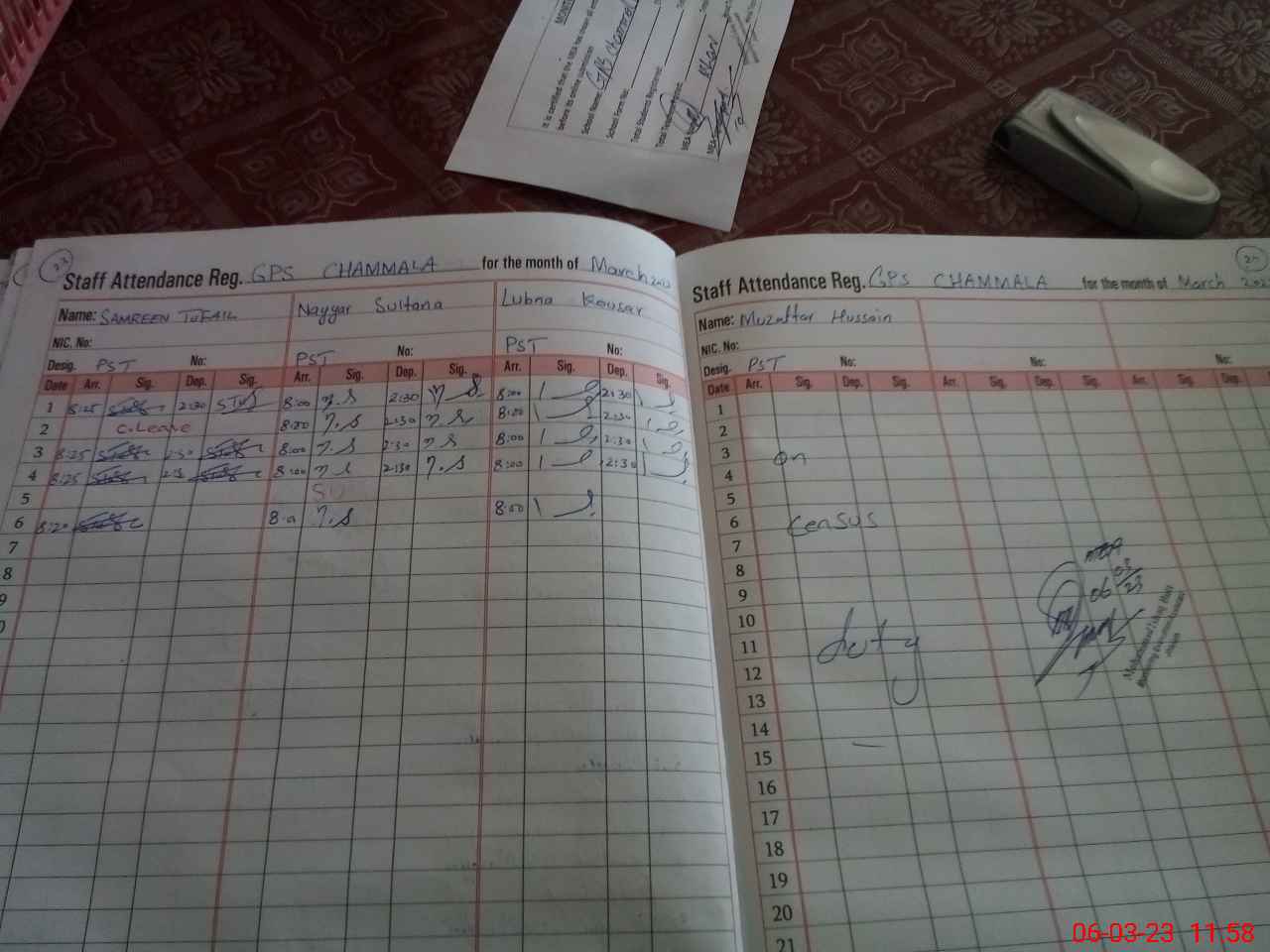 | CNIC | Full Name | Designation | R/C | Absence During Last Calender Month |