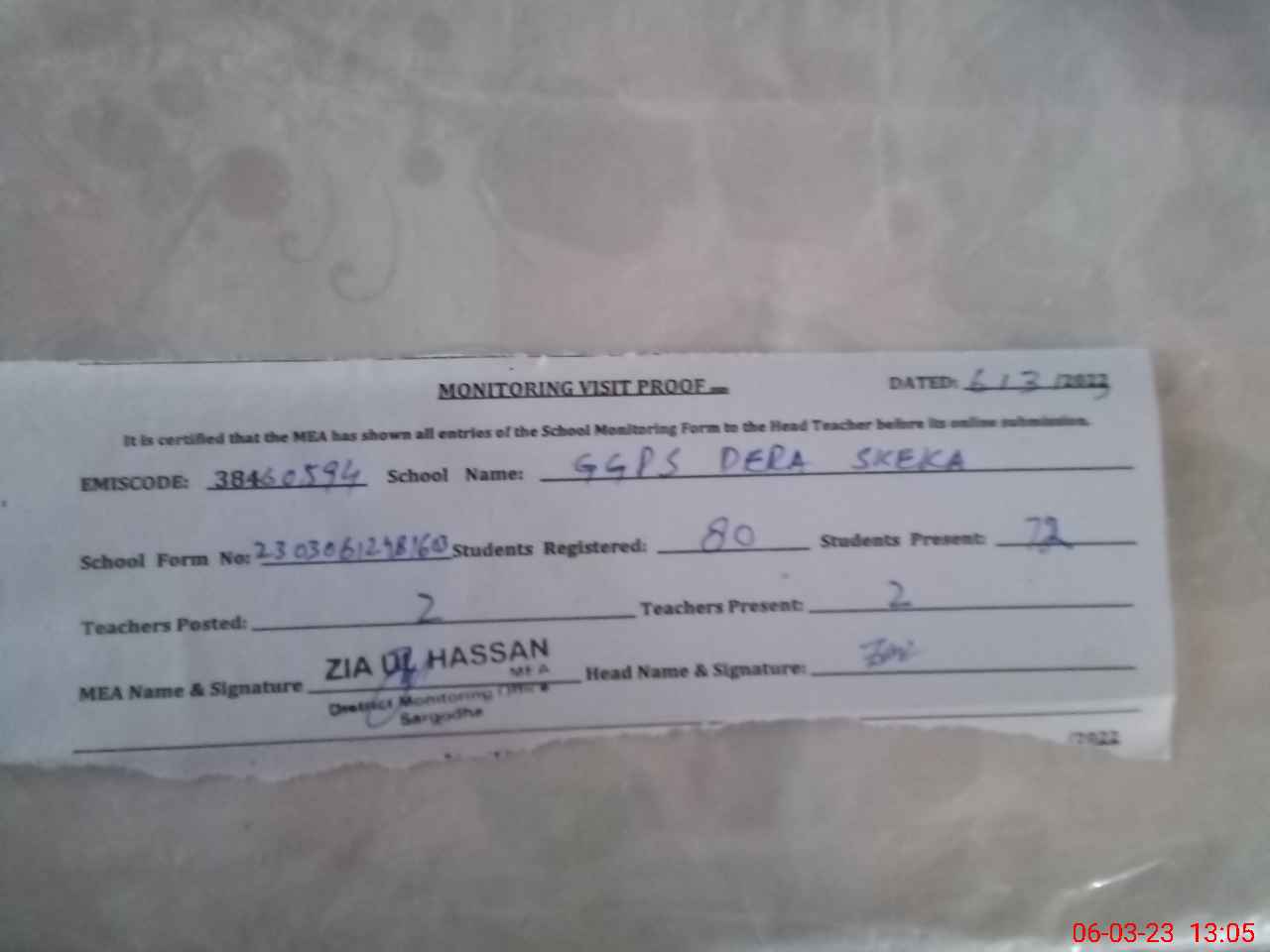 | Attendance Register | Head Teacher | MEA with School | Visit Proof |